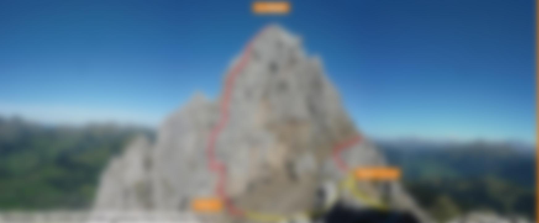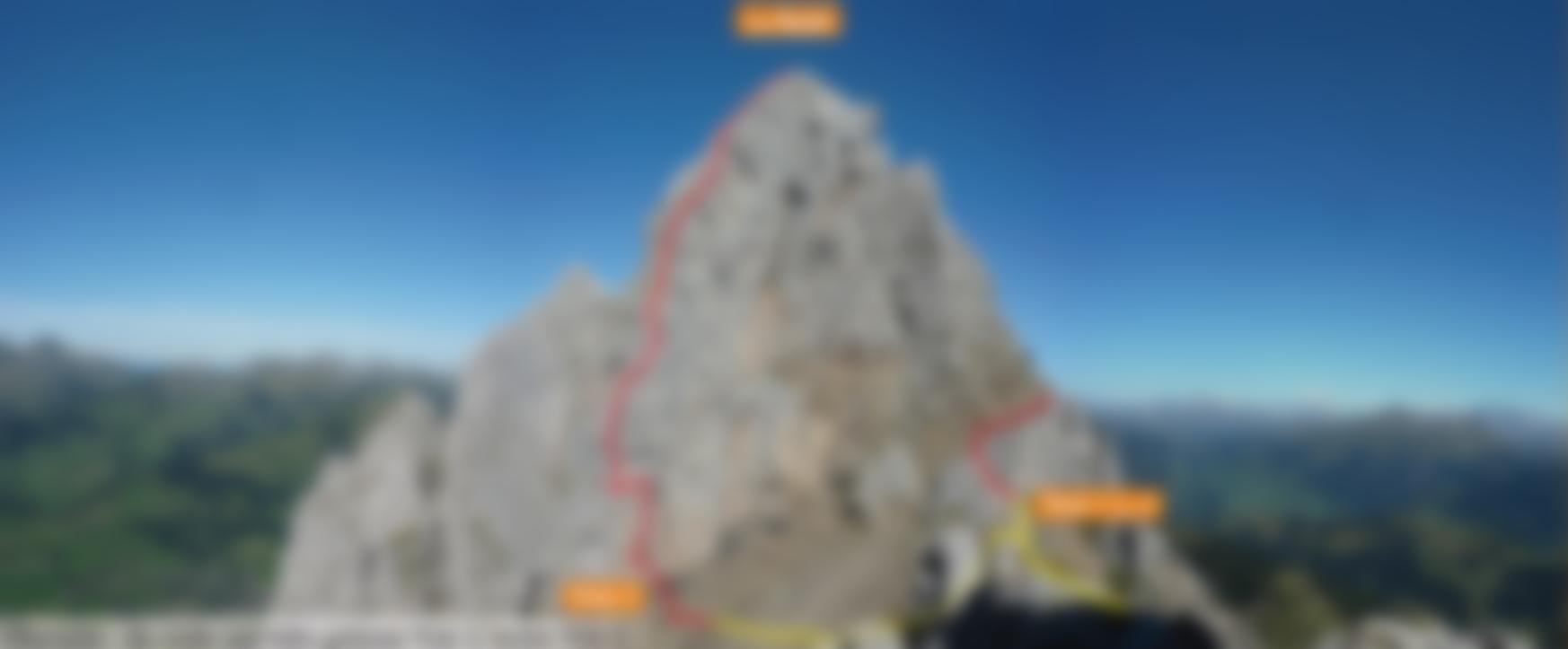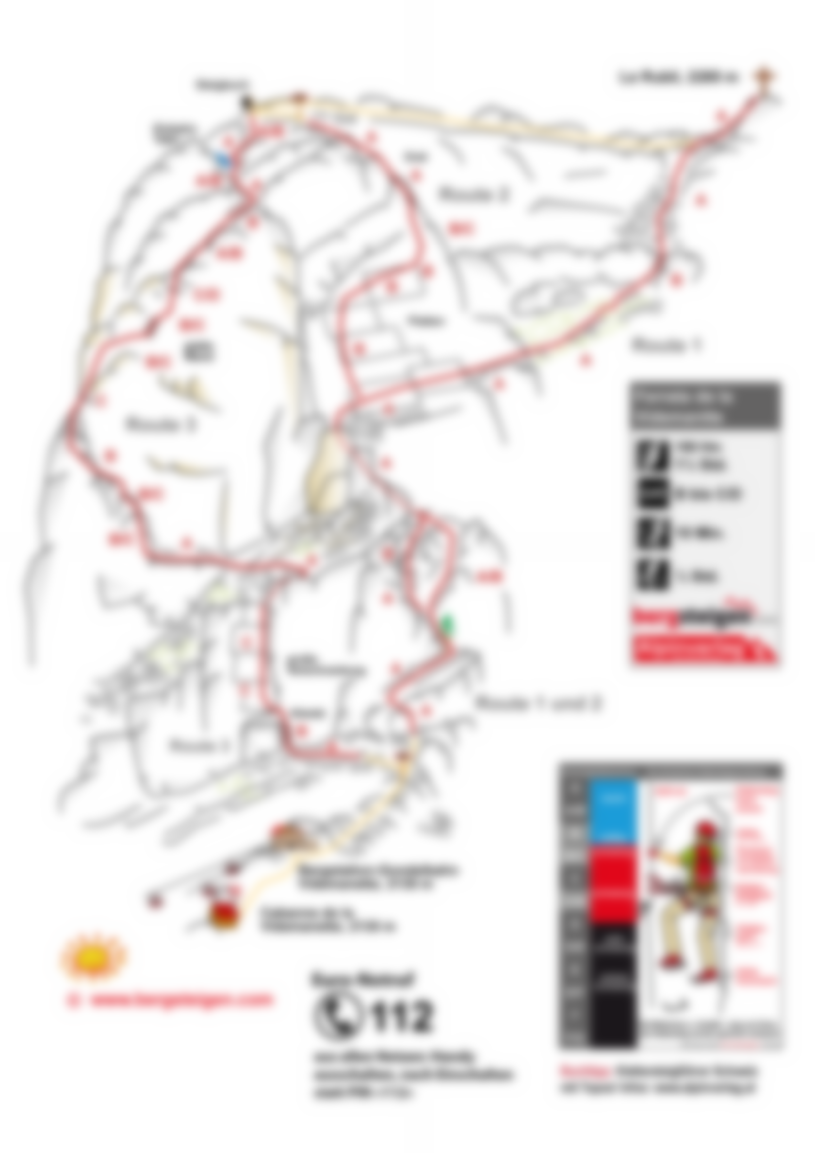 Voie 1 (B) und 2: Von der Tafel einige Schritte geradeaus zum Einstieg. Über den Vorbau (A) hinauf zum Südgrat, um den Grat herum, dann entweder rechts (A/B) oder links (B) über eine Wandstufe auf die schattige Ostseite des Grats und leicht (A) zu einer Plattenzone aufsteigen. Dort zweigt die Voie 2 (B/C) nach links ab und führt unter die Überhänge (B). Mit einer Rechtsquerung zum Südostgrat, dem man anfangs steil (B/C), dann aber wieder flacher werdend (A) zur Verbindung mit der Voie 3 folgt. Dort vereint mit der Route 3 zu Fuß über den Westgrat zum Gipfel. Die Route 1 quert die Plattenzone bis zum Ende (A). Es folgt Gehgelände zu einer kurzen Felsstufe (B), dann über fast durchgängiges Gehgelände hinauf zum Gipfel. Voie 3 (C/D): Von der Tafel kurz nach Norden absteigen bis man bereits im Geröllfeld den Beginn der Versicherungen erreicht. Eine Leiter (B) führt auf den Absatz vor der großen Verschneidung, der man (B/C) bis zum oberen Ende des Vorbaus folgt. Auf dem Band nach links zur Hauptwand, in die man noch einen gutes Stück (A) bis zu einer Rippe hineinquert. Über die Rippe nach rechts hinauf (B/C) und bald wieder zurück nach links zur glatten, steilen Wand mit einer kurzen Leiter (B/C). Danach stellt sich die Route noch mehr auf (C/D) und läuft über einen Grat gemütlich nach rechts aus. Am Ende linkshaltend zur Verbindung mit der Route 2 hinauf (A/B) und vereint zum Gipfel.