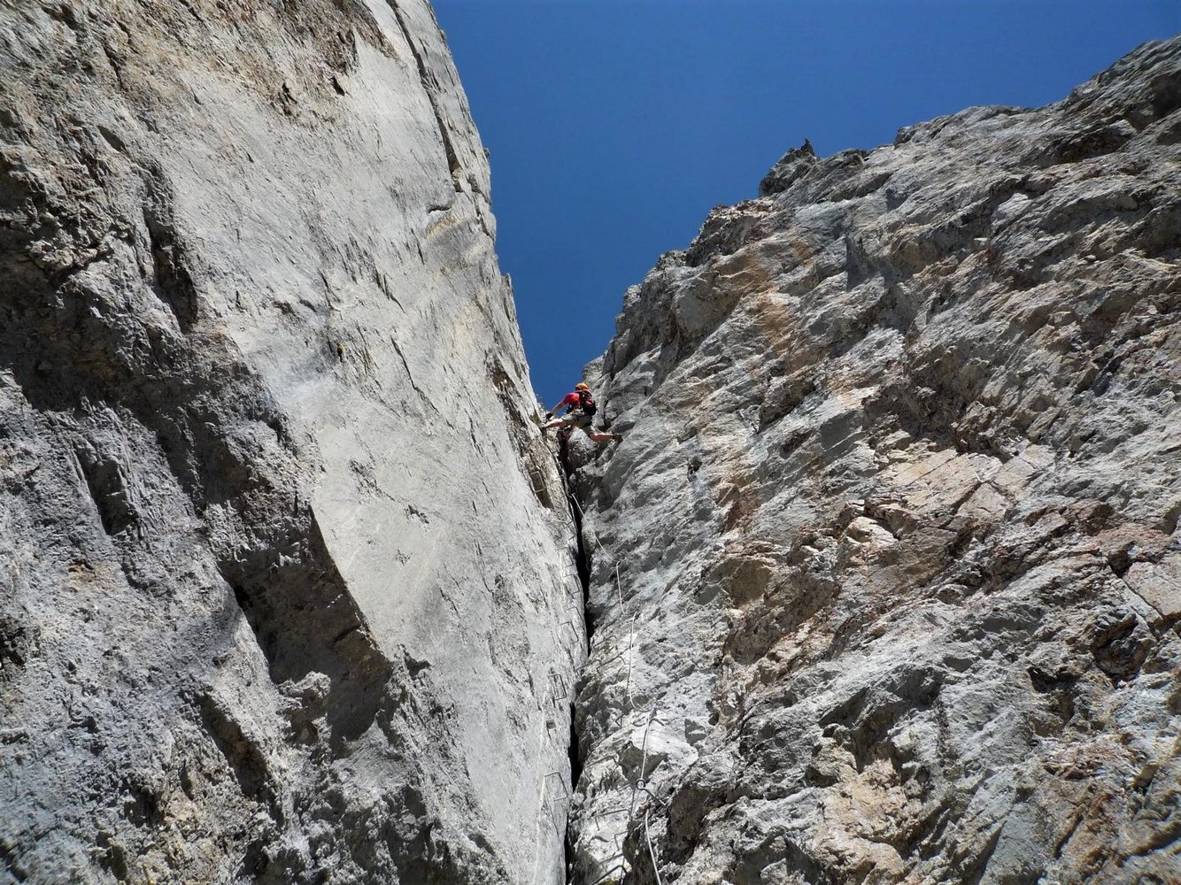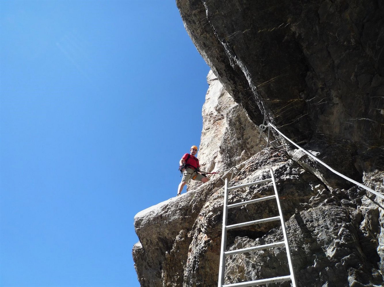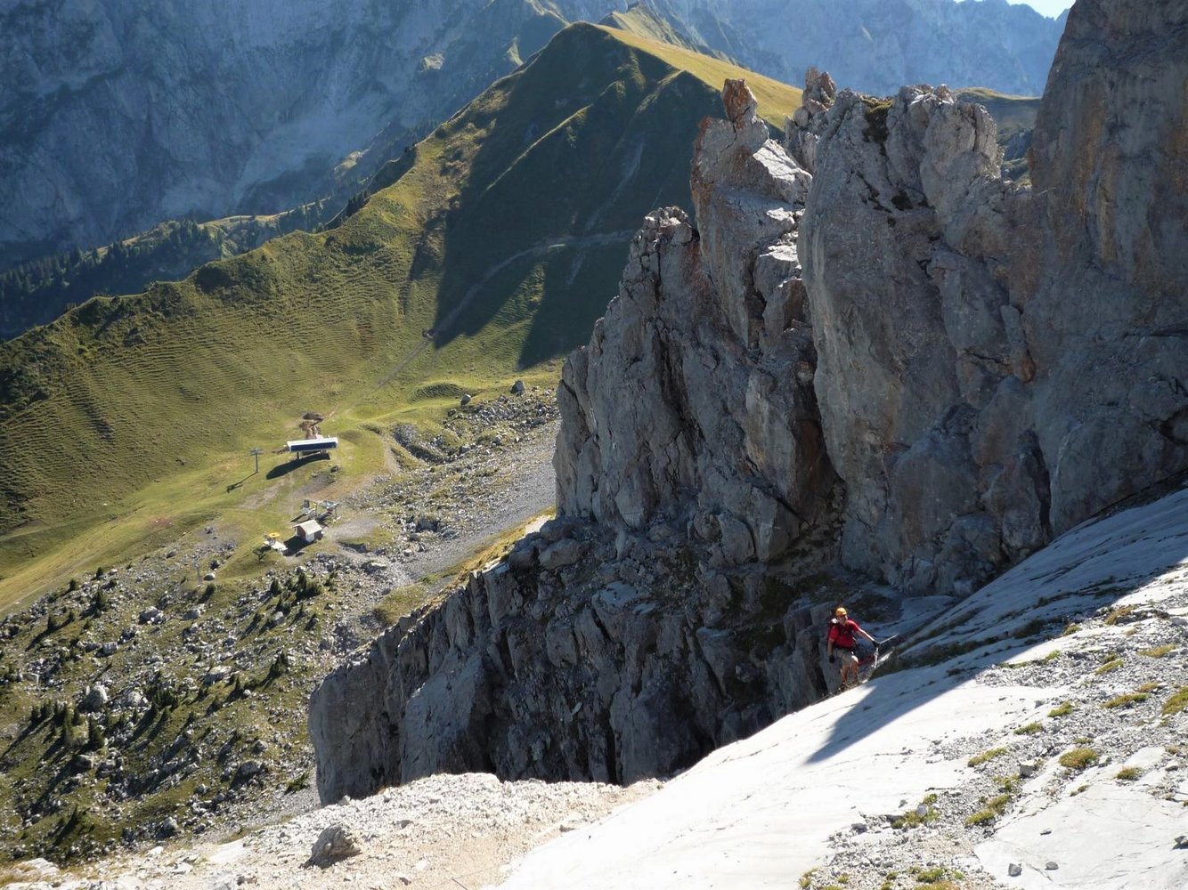 Voie 1 (B) und 2: Von der Tafel einige Schritte geradeaus zum Einstieg. Über den Vorbau (A) hinauf zum Südgrat, um den Grat herum, dann entweder rechts (A/B) oder links (B) über eine Wandstufe auf die schattige Ostseite des Grats und leicht (A) zu einer Plattenzone aufsteigen. Dort zweigt die Voie 2 (B/C) nach links ab und führt unter die Überhänge (B). Mit einer Rechtsquerung zum Südostgrat, dem man anfangs steil (B/C), dann aber wieder flacher werdend (A) zur Verbindung mit der Voie 3 folgt. Dort vereint mit der Route 3 zu Fuß über den Westgrat zum Gipfel. Die Route 1 quert die Plattenzone bis zum Ende (A). Es folgt Gehgelände zu einer kurzen Felsstufe (B), dann über fast durchgängiges Gehgelände hinauf zum Gipfel. Voie 3 (C/D): Von der Tafel kurz nach Norden absteigen bis man bereits im Geröllfeld den Beginn der Versicherungen erreicht. Eine Leiter (B) führt auf den Absatz vor der großen Verschneidung, der man (B/C) bis zum oberen Ende des Vorbaus folgt. Auf dem Band nach links zur Hauptwand, in die man noch einen gutes Stück (A) bis zu einer Rippe hineinquert. Über die Rippe nach rechts hinauf (B/C) und bald wieder zurück nach links zur glatten, steilen Wand mit einer kurzen Leiter (B/C). Danach stellt sich die Route noch mehr auf (C/D) und läuft über einen Grat gemütlich nach rechts aus. Am Ende linkshaltend zur Verbindung mit der Route 2 hinauf (A/B) und vereint zum Gipfel.