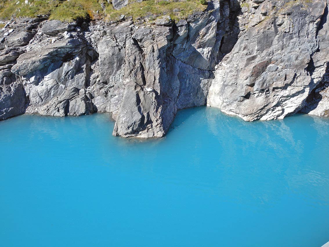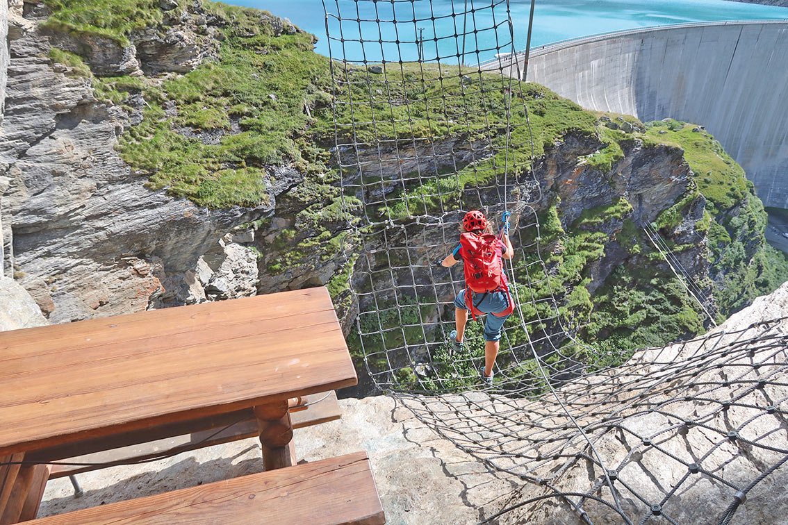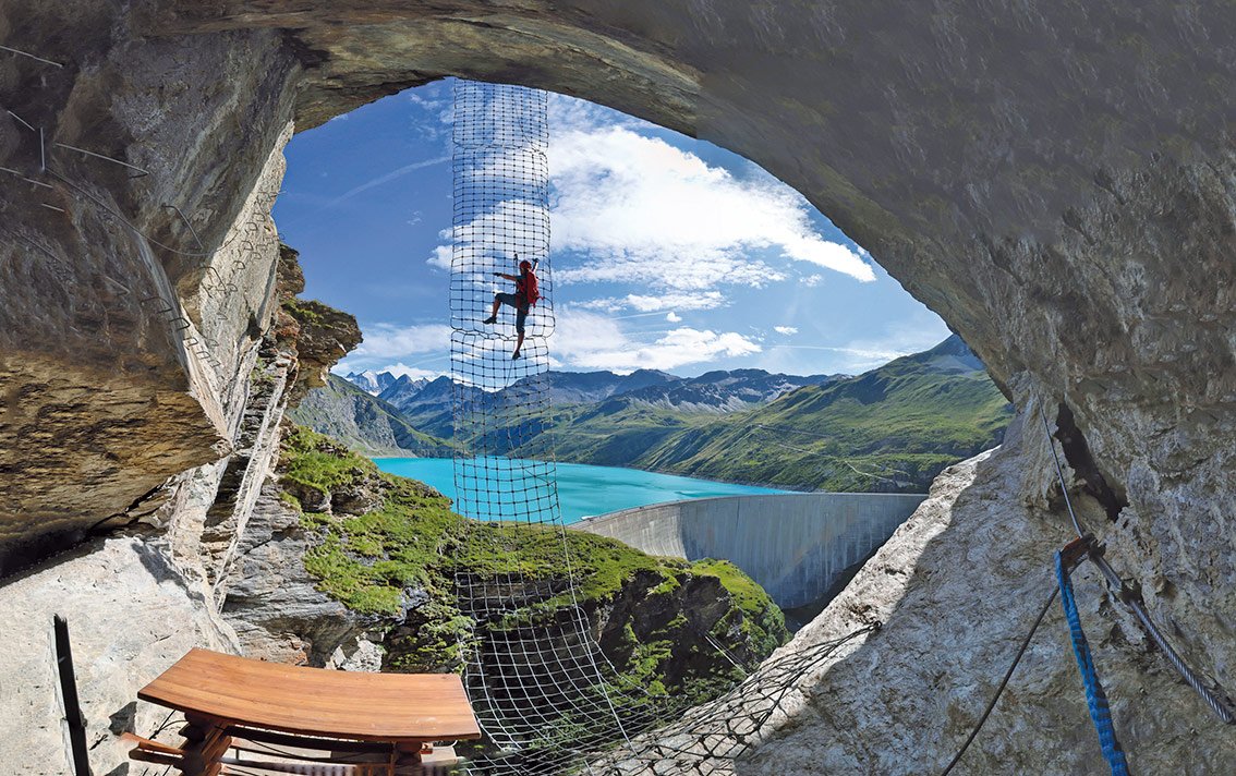 Es ist schon ein mulmiges Gefühl direkt unter der 148 m hohen Bogenstaumauer aus dem Auto bzw. dem Bus zu steigen, insbesondere wenn man weiß, dass von der anderen Seite ein 2,4 km langer Stausee mit 77 Mio. m³ Wasser auf die Mauer drückt. Umso rascher erreicht man den Einstieg und schlängelt sich im ersten Teil bis zur Hängebrücke hinauf. Dort geht man zumindest für ein paar Fotos auf die ca. 80 Meter lange Brücke und legt eine Rast ein, denn was einem auf den nächsten Metern erwartet, lässt sich problemlos in die Rubrik Ferrata-Extrem einordnen. Enorm überhängend und steil zieht die Route zur Gitè du Lac de Moiry hinauf. Wer sich dem Überhang nicht gewachsen fühlt, steigt über die Hängebrücke aus. Die Tyrolienne ist nur mit Bergführer erlaubt und der dahinterliegende Ausstieg nicht sehr lohnend.