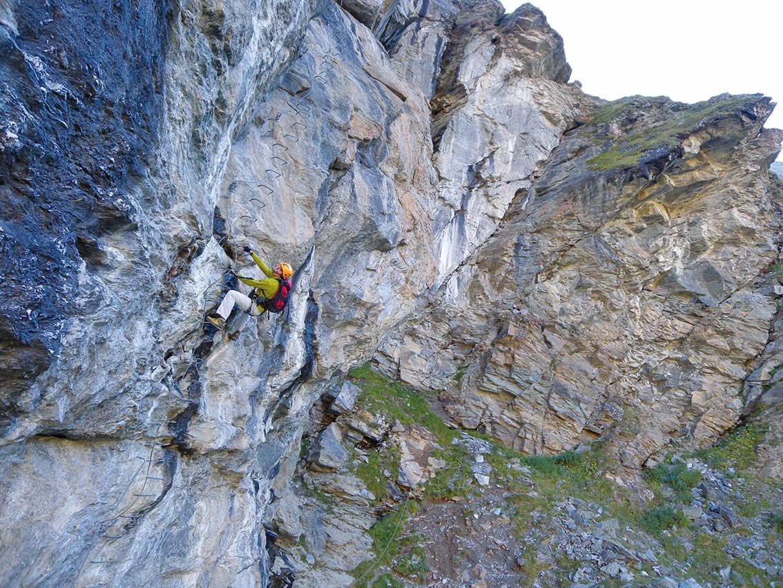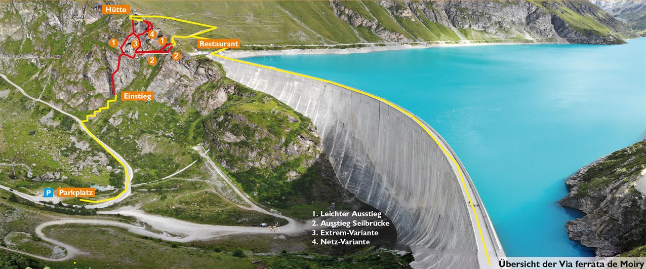 Ein kurzer Vorbau (B/C) leitet zu einer schwarzen Plattenzone (B), die man am oberen Ende steiler werdend nach rechts verlässt (B/C). Man erreicht einen Absatz unter dem Ende der Tyrolienne (diese nur mit Bergführer benutzen) - man befährt sie von der anderen Seite. Es folgt ein kurzer Abstieg unter die Hängebrücke und hinauf auf den Block (B), oder nach rechts den einfachen (A und kurz B) Ausstieg nehmen, der am Ende jedoch durch eine unschöne Rinne führt. Leichte Variante (C): Wer sich die Extremvariante nicht zutraut nimmt die ca. 80 m lange Hängebrücke (B) hinüber zum Restaurant. Extrem-Variante (D/E): Die Extremvariante beginnt konstant überhängend (D/E), wird dann aber bald leichter (C/D) und läuft in einer schönen Verschneidung (B/C) hinauf zur Gitè du Lac de Moiry aus. Oben gibt es eine Variante zum gewaltigen Netz (C), bei der Hütte auch ein Steigbuch und einen prächtigen Ausblick auf den großen Stausee.