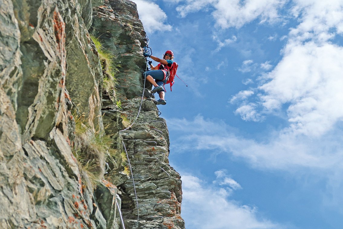 Komplette Klettersteigausrüstung, Klettersteighandschuhe und Helm; für Schwächere, die sich in die Extrem-Variante trauen ein Sicherungsseil.