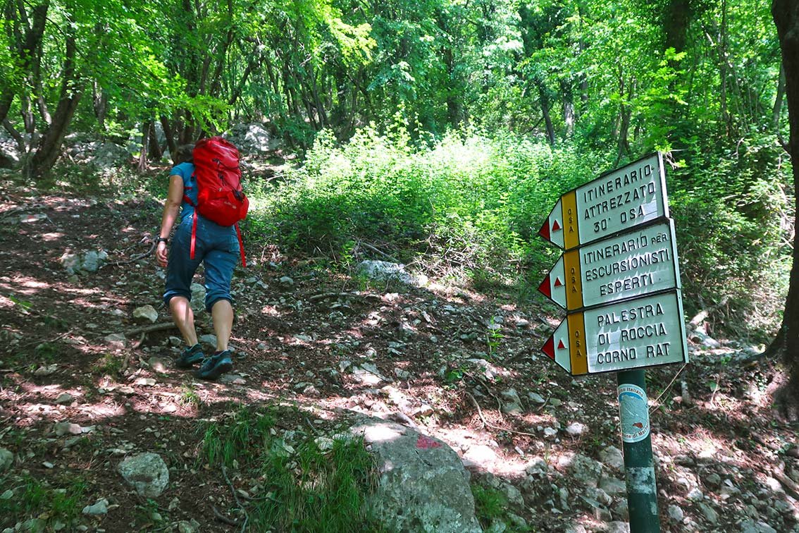 Vom Ortsteil Belvedere marschiert man auf dem Fahrweg hinauf nach San Tomaso (Kapelle, schöner und beliebter Aussichtspunkt). Von dort hält man sich rechts auf dem Wanderweg Richtung Moreggallo, bis man dann vom Weg links zur "Itinerario Attrezatto 30° OSA abzweigt und steil bis zum Einstieg aufsteigt.