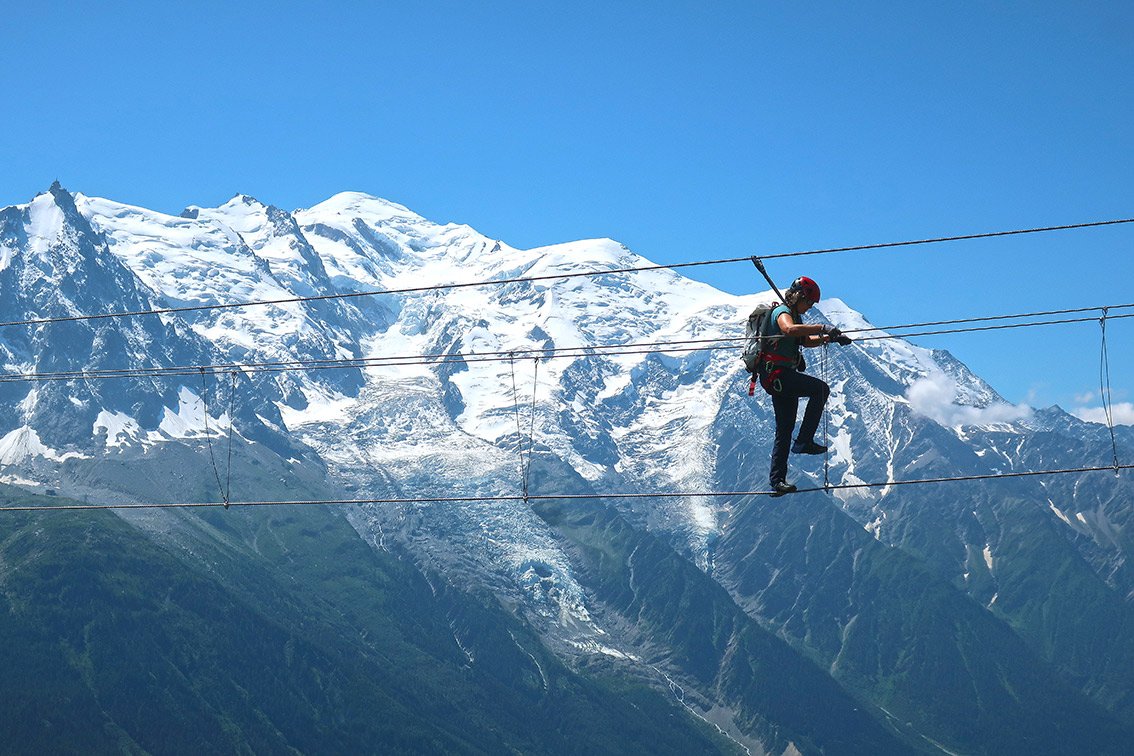 Die Ferrata des Evettes ist ein Klettersteig, bei dem die Aussicht auf den Mont Blanc im Mittelpunkt der gesamten Unternehmung steht. Die wirklich gut gemachte Ferrata mit den steilen Klammern-Passagen und Seilbrücken ist quasi Nebensache, wenn man am Ende auf der 50 Meter langen Dreiseilbrücke direkt in Höhe des Mont Blanc zum Ende des Klettersteiges schwebt. Eine gut gemachte Ferrata, die man sich bei einem Chamonix-Besuch auf jeden Fall einmal anschauen sollte!