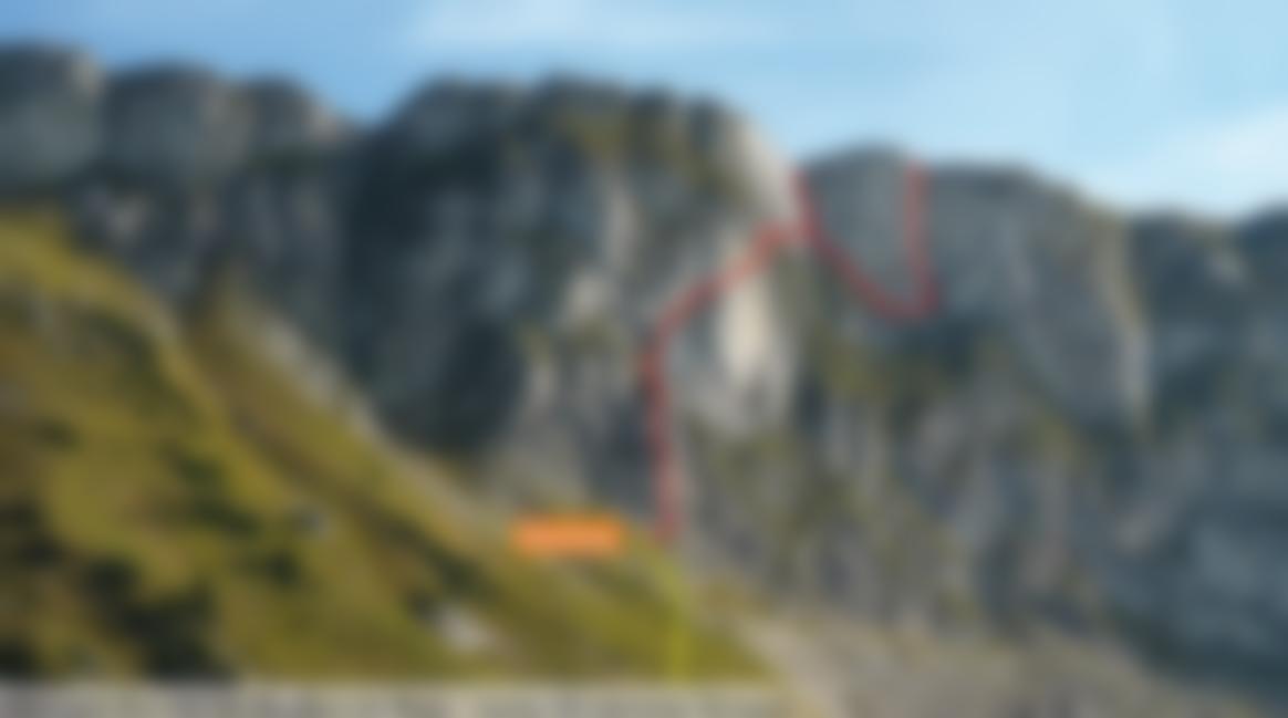 Zu Beginn über einen sehr steilen, sogar leicht überhängenden Pfeiler (bis C/D) auf einen Absatz, der zur ersten Rast einlädt. Eine kleine Seilbrücke und ein kurzer Aufschwung führen zu einer höhlenartigen Nische. An dieser vorbei zu einer kompakten Wand, die nach rechts ansteigend gequert wird. Über einen überhängenden Pfeiler (D) zu einem weiteren Absatz mit Rastmöglichkeit. Leicht absteigend nach rechts zu einer Tafel queren. Dort zweigt die Variante zum Notausstieg (bis B/C) ab. Eine Felsstufe zu einem grasigen Band abklettern und über dieses zur Ausstiegswand, an deren Fuß man nochmals Kraft tanken sollte. Um eine überhängende Kante herum zur überhängenden und kraftraubenden Schlüsselstelle (D/E) und weiter zum Ausstieg.