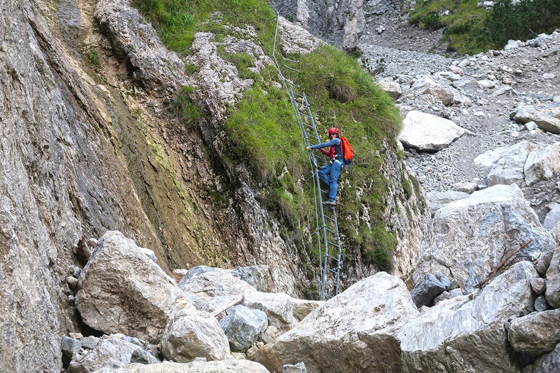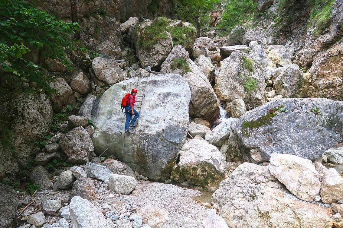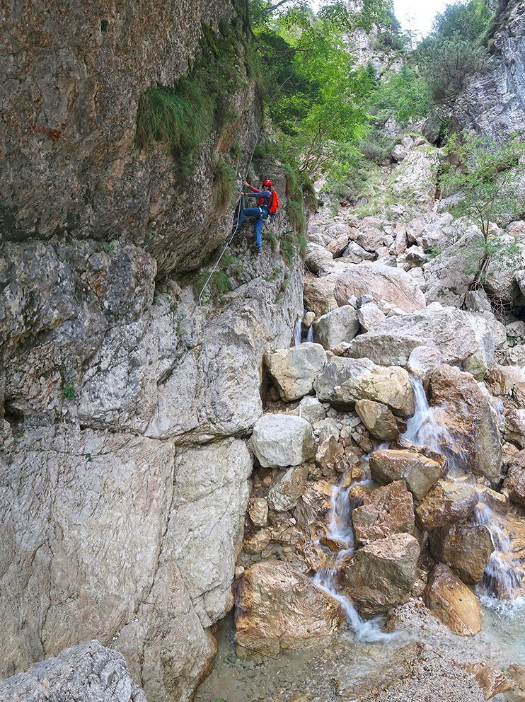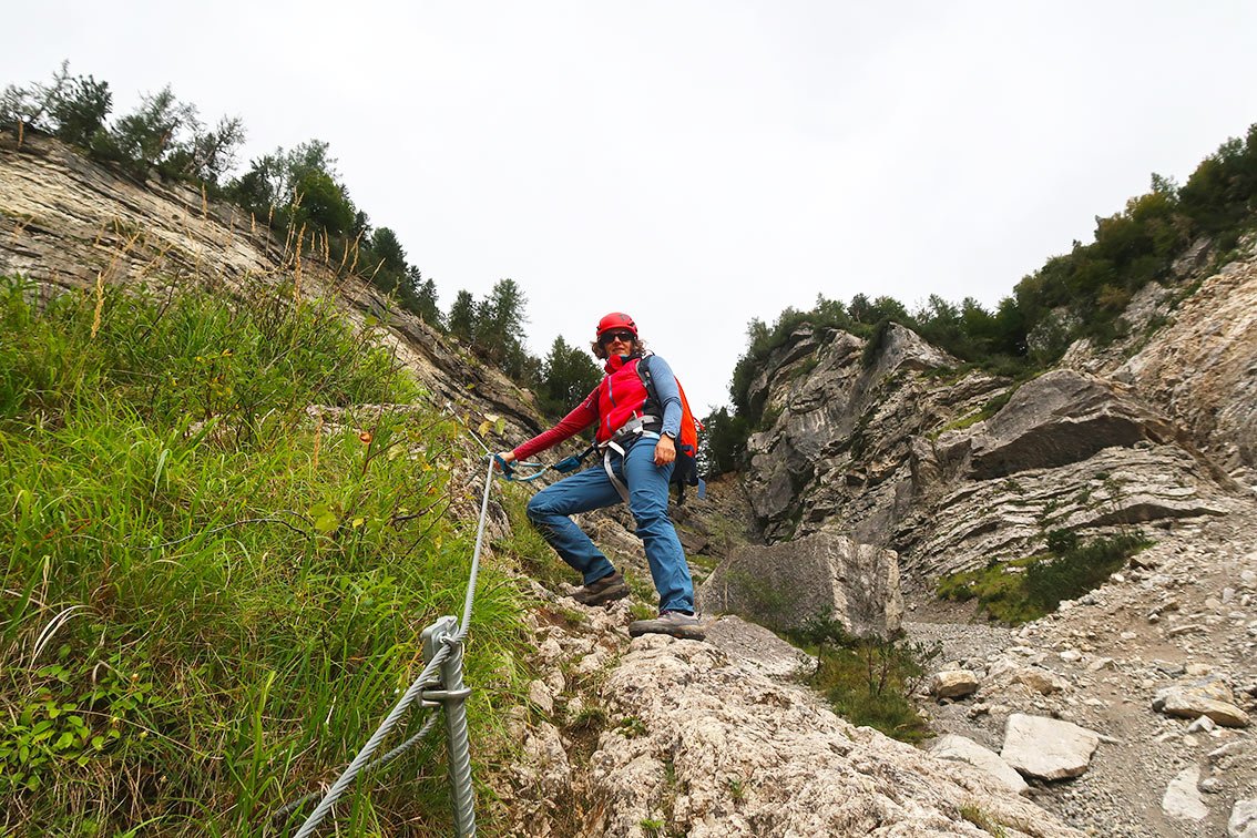 Die Ferrata ist bei Nässe heikel und bei Gewittergefahr extrem gefährlich (der Bach füllt sich mit Wasser und Steine werden von den Hängen gespült)!