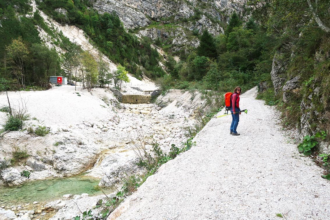 Vom Parkplatz beim Albergo Vedova auf der Asphaltstraße Richtung Norden gehen. Bei der ersten Kehre zweigt der Weg 233 gerade in das Val Scura ab. Man folgt dem Weg links bzw. rechts vom Bach bis zur ersten Seilsicherung bei einem großen Stein mit roter Markierung.