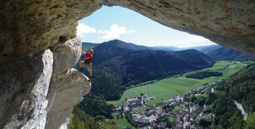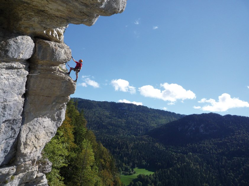 Die Ruhe ist vorbei! Bis vor wenigen Jahren hatte der Mauerläufer (Tichodroma muraria) die Felsbänder der La Clusette oberhalb des Ortes Noiraigue noch für sich alleine. Heute muss er sie vom 1. August bis 31. Dezember mit Ferratisten teilen, den Rest des Jahres können die Mauerläufer wieder unter sich sein, denn von Jänner bis Ende Juli ist der Klettersteig geschlossen. Die Ferrata besteht größtenteils aus Spaziergelände und besticht durch ihre großartigen Tiefblicke in das Val de Travers und auf den Ort Noiraigue. Um diese Aussicht auch gut genießen zu können, wurden extra Rastseile eingerichtet.