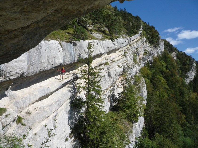 Gemütlich (A und B) auf dem Band nach Osten bis zu einer Unterbrechungsstelle (B/C). Danach wieder leicht ansteigend und unschwierig (A und B) weiter, bis das Band plötzlich aufhört. Dort kurz absteigen (B) und gleich wieder im glatten Fels (C) hinauf zum Surplomb du Nid, dem ultimativen Fotopunkt. Danach geht es wieder auf dem leichten (A) Band hinauf zum letzten Rastseil und weiter zum Steigbuch. Zuletzt noch ein etwas steiler, aber leichter (A) Aufstieg zum Ende der Versicherungen.