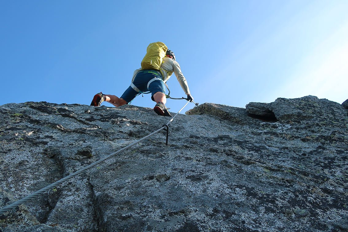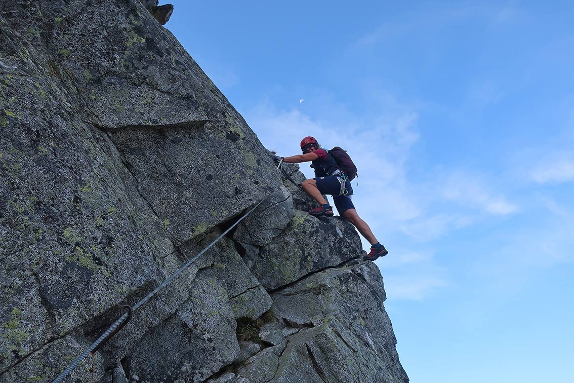 Hochalpiner Klettersteig mit weiten Ankerabständen (Stand Sommer 2025). Klettererfahrung (auch für den restlichen, kurzen Gipfelaufstieg) von Vorteil.