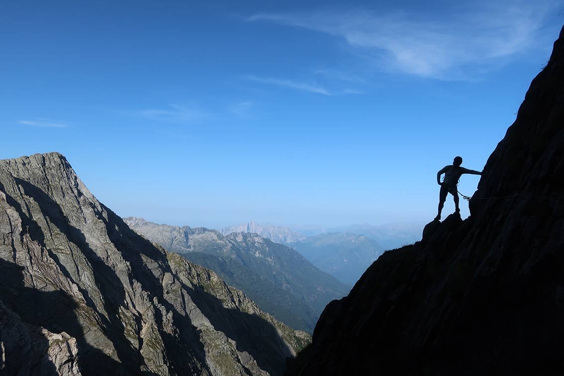 Die Ferrata Erminio Arosio ist ein historischer, alpiner Klettersteig am Corno di Grevo. Der Anstieg hat alles, was ein solides Bergabenteuer braucht - ein anspruchsvoller Klettersteig, ein fast 3000 m hoher Berggipfel und das mitten im Adamello-Gebirge. Der kühn angelegte Grat-Klettersteig ist mit nur ganz wenigen Trittklammern ausgestattet, wer sich ohne die Füße auf den kleinen Leistentritten einzusetzen nur am Stahlseil rauf zieht, wird an seine Grenzen kommen. Erreicht man den Gipfel, hat man einen fantastischen Ausblick auf die bekannten Eisriesen des Adamello - ein toller, langer Gratklettersteig der Extraklasse.