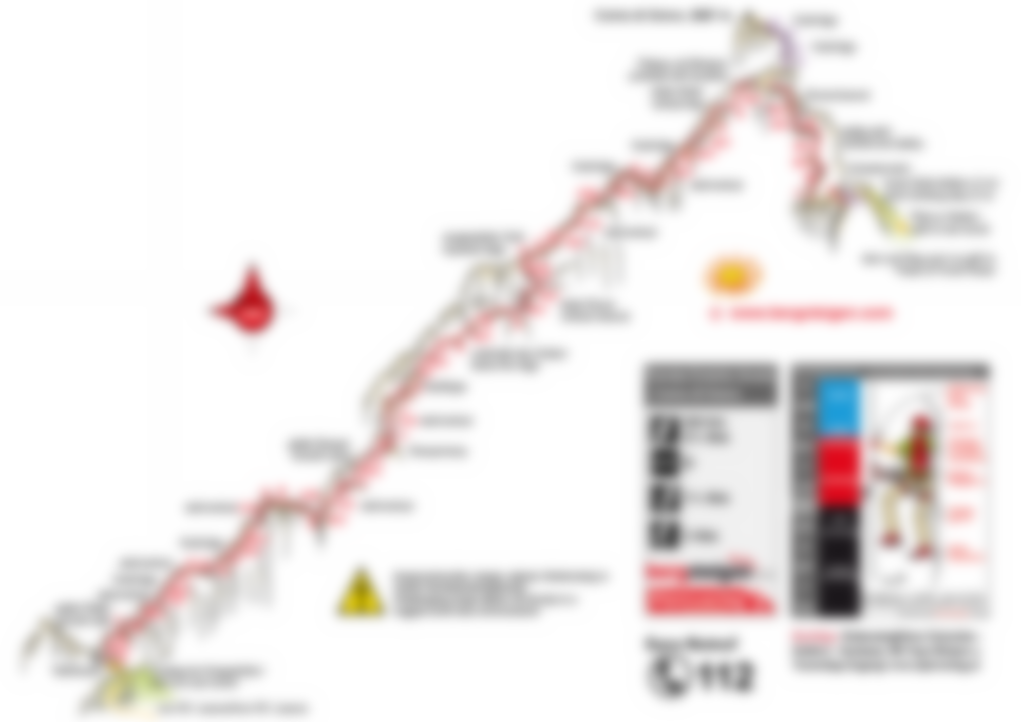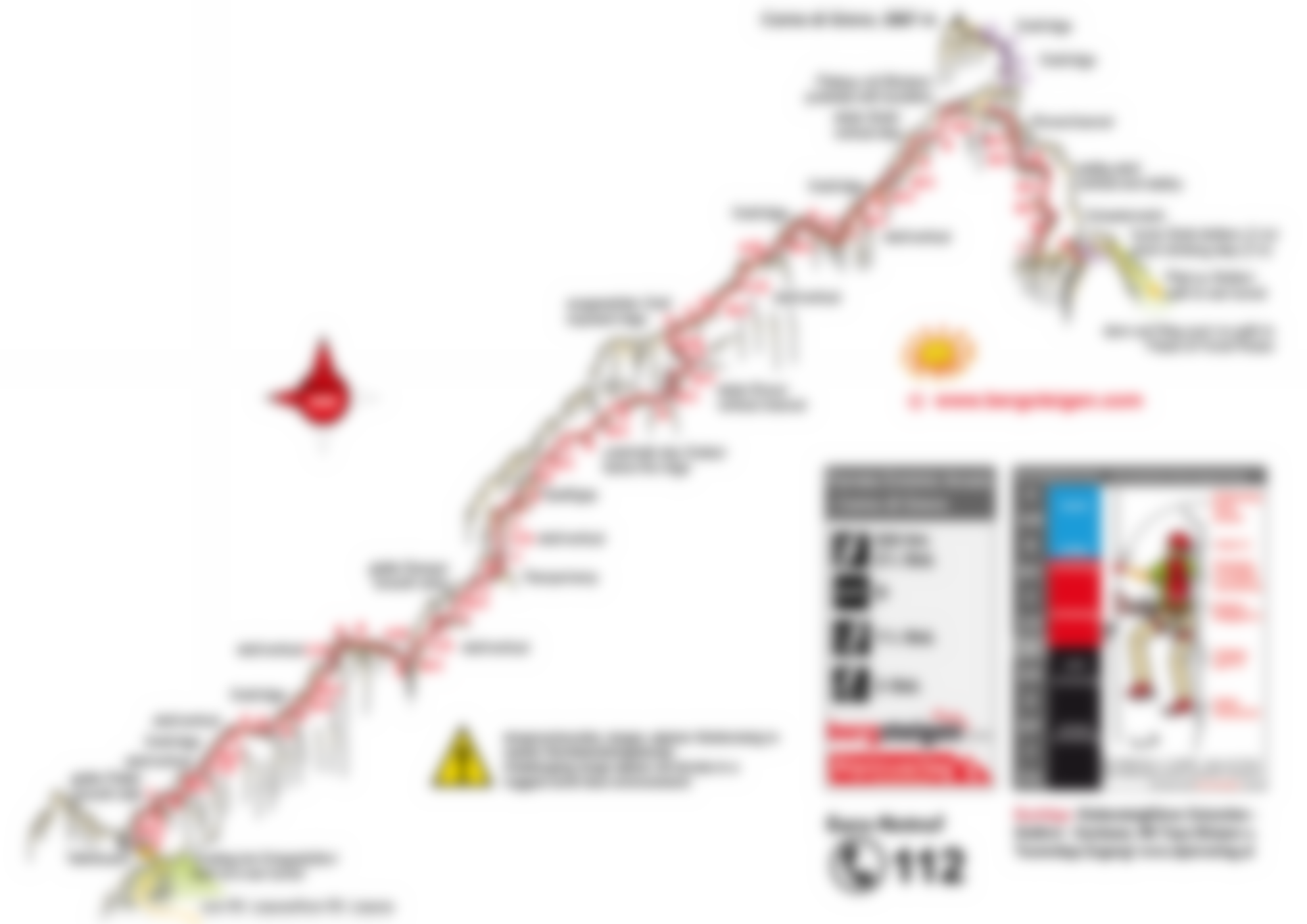 Siehe Topo. Die Ferrata folgt primär dem Nordwestgrat (Stufen bis max. D, oft C/D und C) und endet kurz unterhalb des Gipfels des Corno di Grevo. Am Ende klettert man noch 10-15 Minuten (markiert) auf dem griffigen und nicht so ausgesetzten Grat zum Gipfel (dieses Stück muss auch wieder abgeklettert werden).