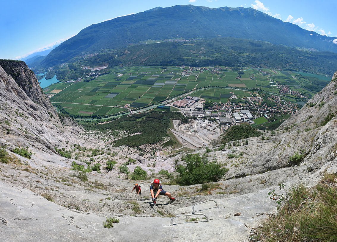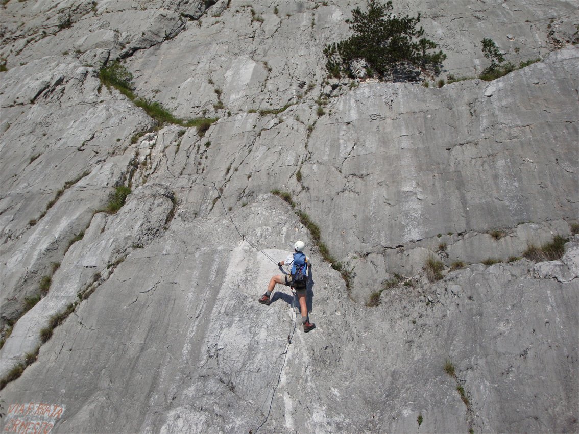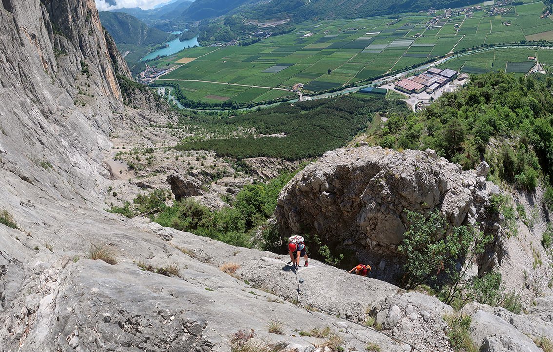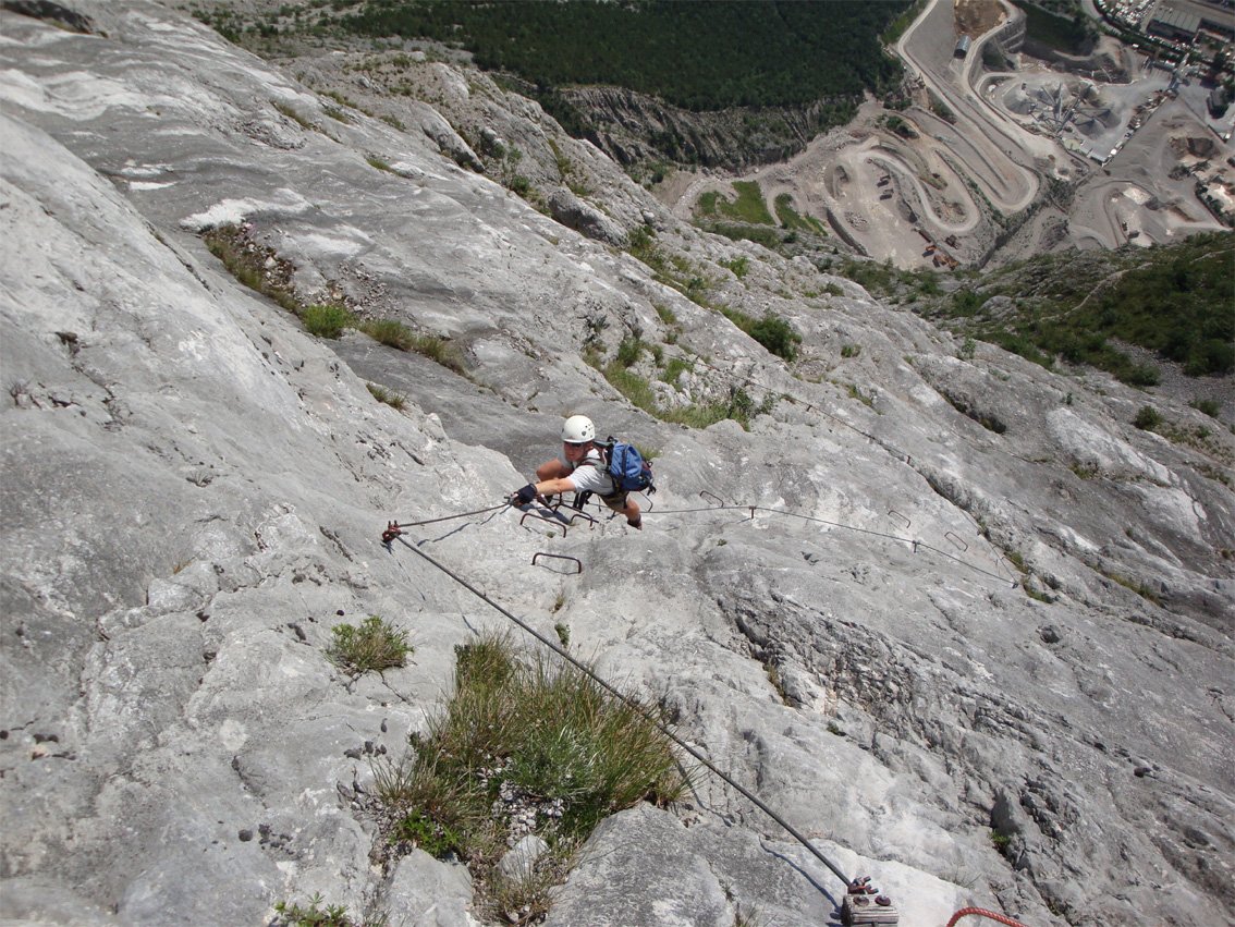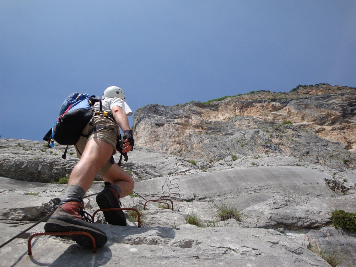 Anmerkung: Mit gesamt 1400 Hm der längste Klettersteig beim nördlichen Gardasee, vor allem im Sommer sollte man die Tour nicht unterschätzen. Bei Nässe ist die Ferrata wegen der oberen, erdigen Gehpassagen nicht zu empfehlen. Es liegt auf den Bändern viel Schutt - Steinschlag ist also in Thema. In den Sommermonaten Juli und August ist auf kühles Wetter zu achten.