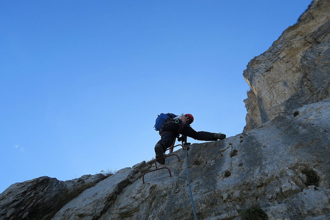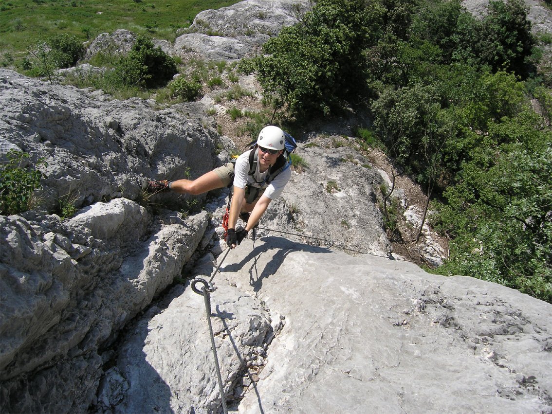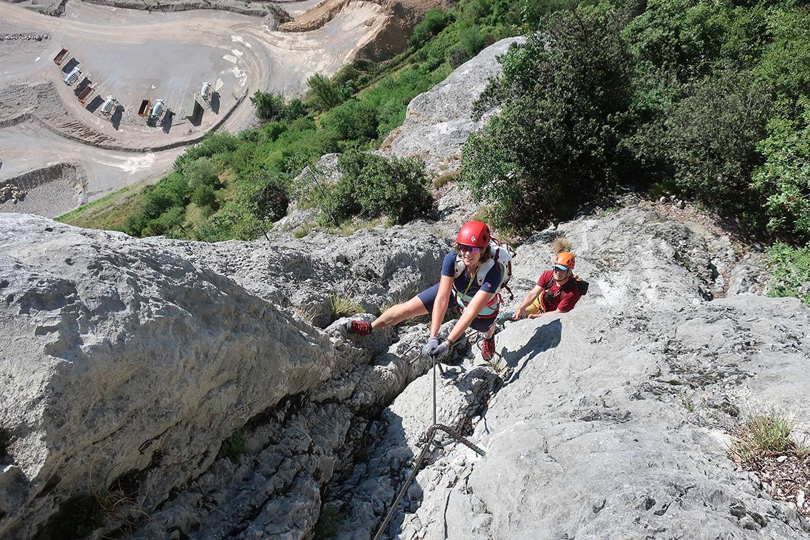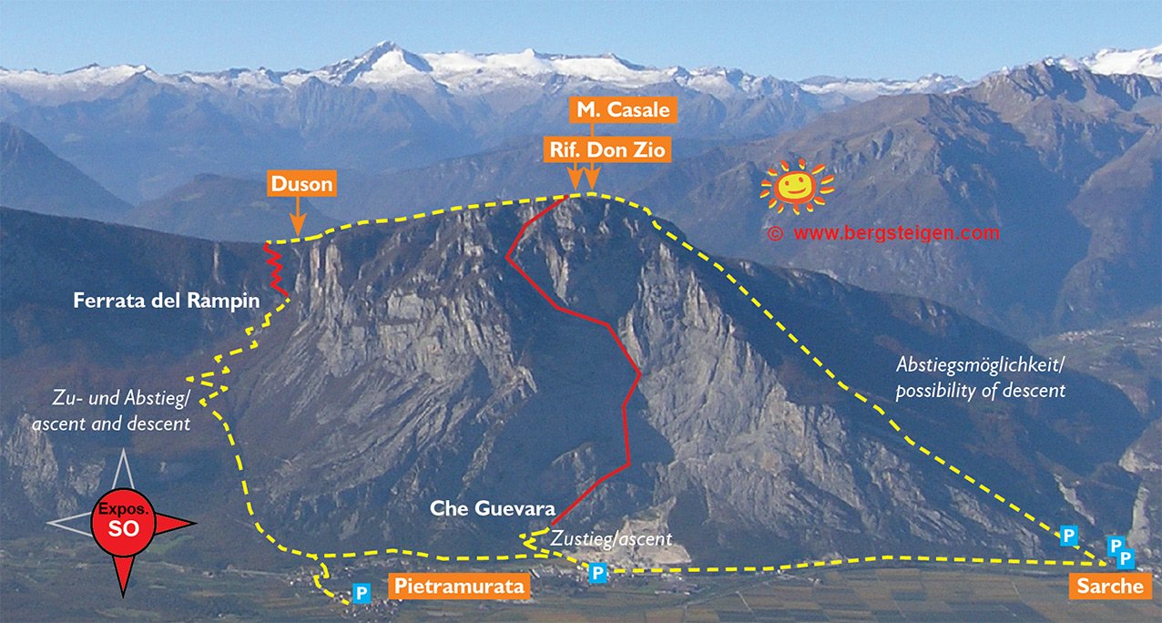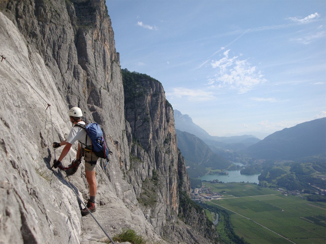 Anmerkung: Mit gesamt 1400 Hm der längste Klettersteig beim nördlichen Gardasee, vor allem im Sommer sollte man die Tour nicht unterschätzen. Bei Nässe ist die Ferrata wegen der oberen, erdigen Gehpassagen nicht zu empfehlen. Es liegt auf den Bändern viel Schutt - Steinschlag ist also in Thema. In den Sommermonaten Juli und August ist auf kühles Wetter zu achten.