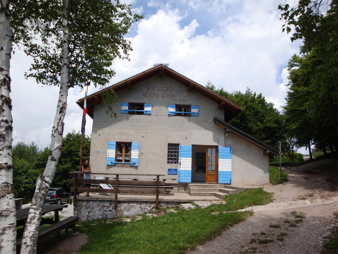 Vom Ausstieg mit wenigen Schritten dem Pfad auf die Hochfläche folgen. Zum Rifugio Don Zio absteigend. Vom Rifugio steigt man schnellsten entlang der Ferrata del Rampin (siehe Topo, 245 Hm/ kurz B, meist um A, steiler Wald, mit Stahlseil gesichert, bei Nässe anspruchsvoll) ab. Man folgt zuerste südliche dem Weg 411, zweigt dann aber auf ca. 1450 links auf den Weg 408 ab. Diesem folgt man bis man auf dem Kamm die Abzweigung nach Osten Ferrata Rampin (Weg 426) erreicht. Auf diesem (Nr. 426) steigt man anfangs mit Seilen gesichert nach Pieatramurata ab.