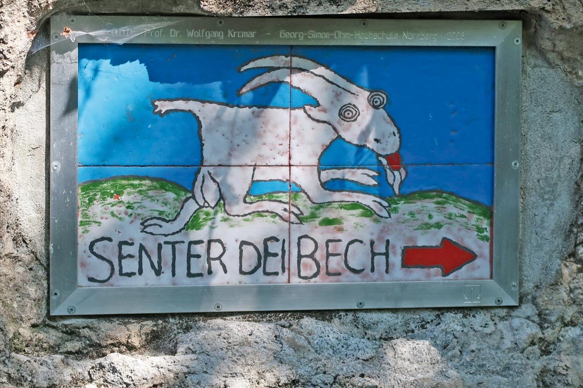 Im Ort rechts den Beschilderungen folgen (Weg 417). Nach kurzer Zeit auf gepflastertem Fahrweg geht es rechts auf dem Sentiero dei Bech (Weg 470) in Richtung Klettersteig. Bei einer Abzweigung zweigt links der Sent. Laste ab, Weg 471 (siehe Topo)