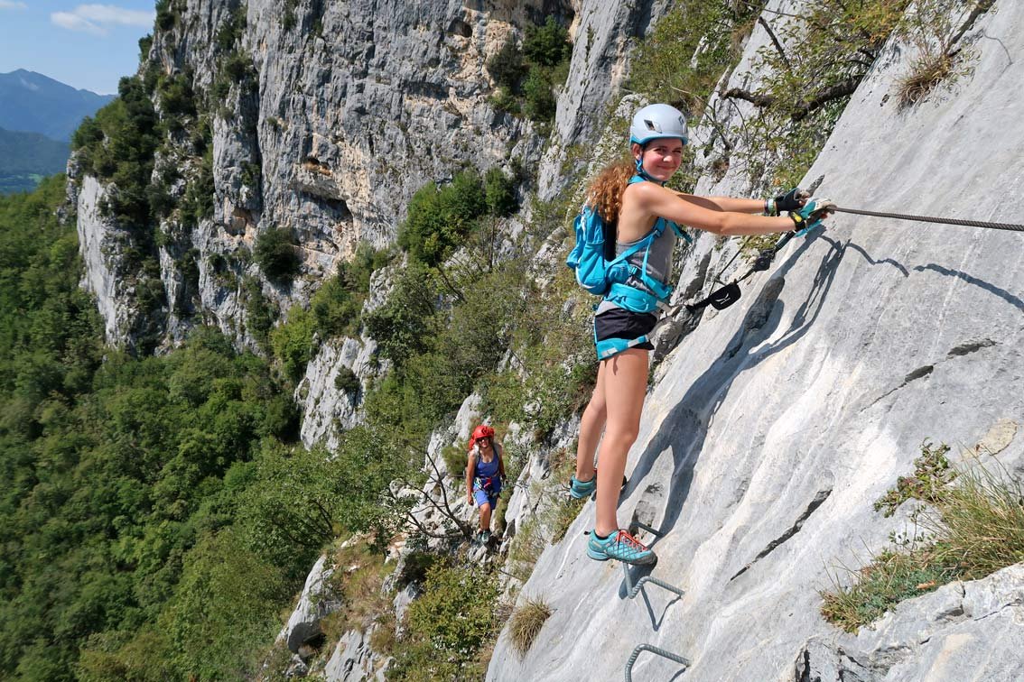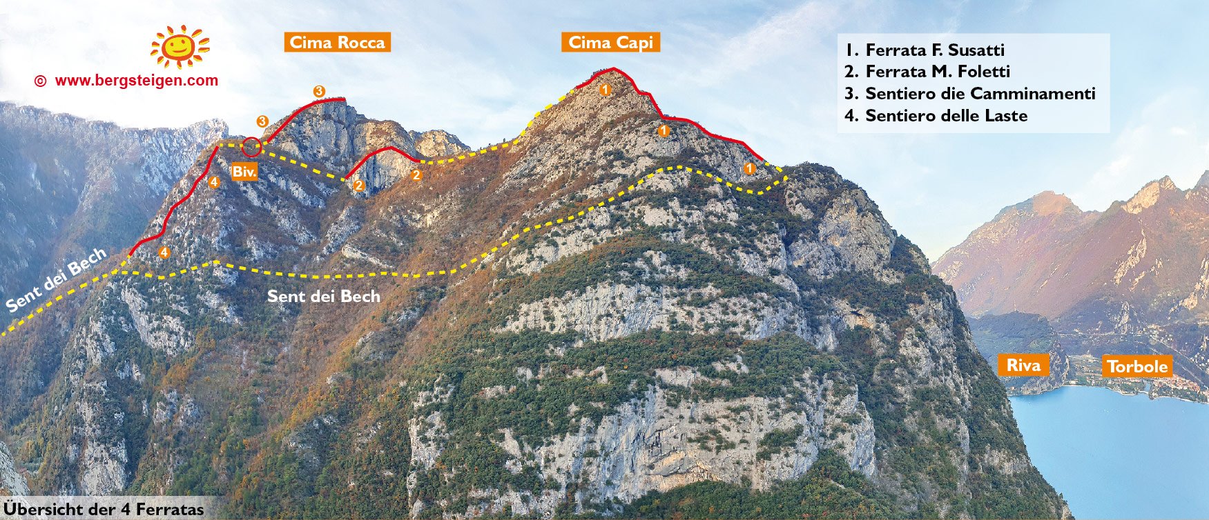 Unweit der Seemetropole Riva del Garda klettert man hoch über den blauen Fluten des Gardasees an der Südkante zum Gipfel der Cima Capi empor (Ferrata Sussati), von dort führen zwei weitere, sehr schön hergerichtete, leichte Klettersteige auf das Dach der Runde, den Gipfel der Cima Rocca. Egal ob man von Biacesa oder direkt von Riva del Garda zum Einstieg aufbricht, taucht man durch dichten Buschwald zu leichten, aber schönen Kletterpassagen und luftigen Graten empor. Oben dann das kühle Finale im Inneren der Cima Rocca. Der Gipfel des Berges lässt sich entweder über steile, versicherte Schützengräben oder in einem markierten Kavernensystem aus dem Ersten Weltkrieg im Inneren erforschen. Egal ob unter- oder oberirdisch, die landschaftlich schöne Klettersteigrunde ist vor allem bei Einsteigern sehr beliebt!