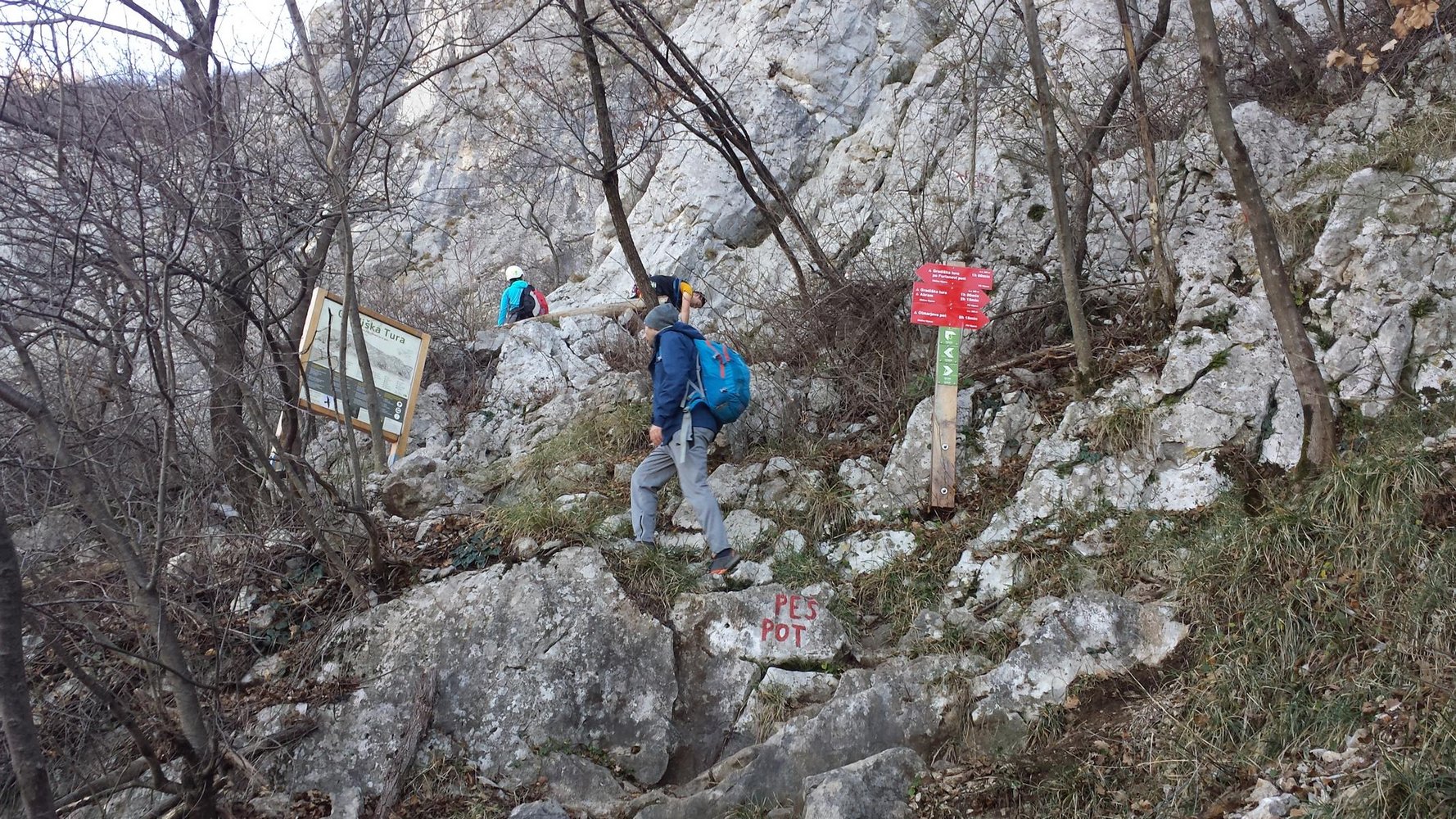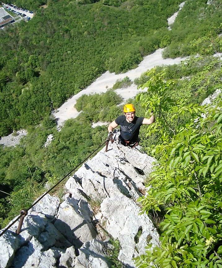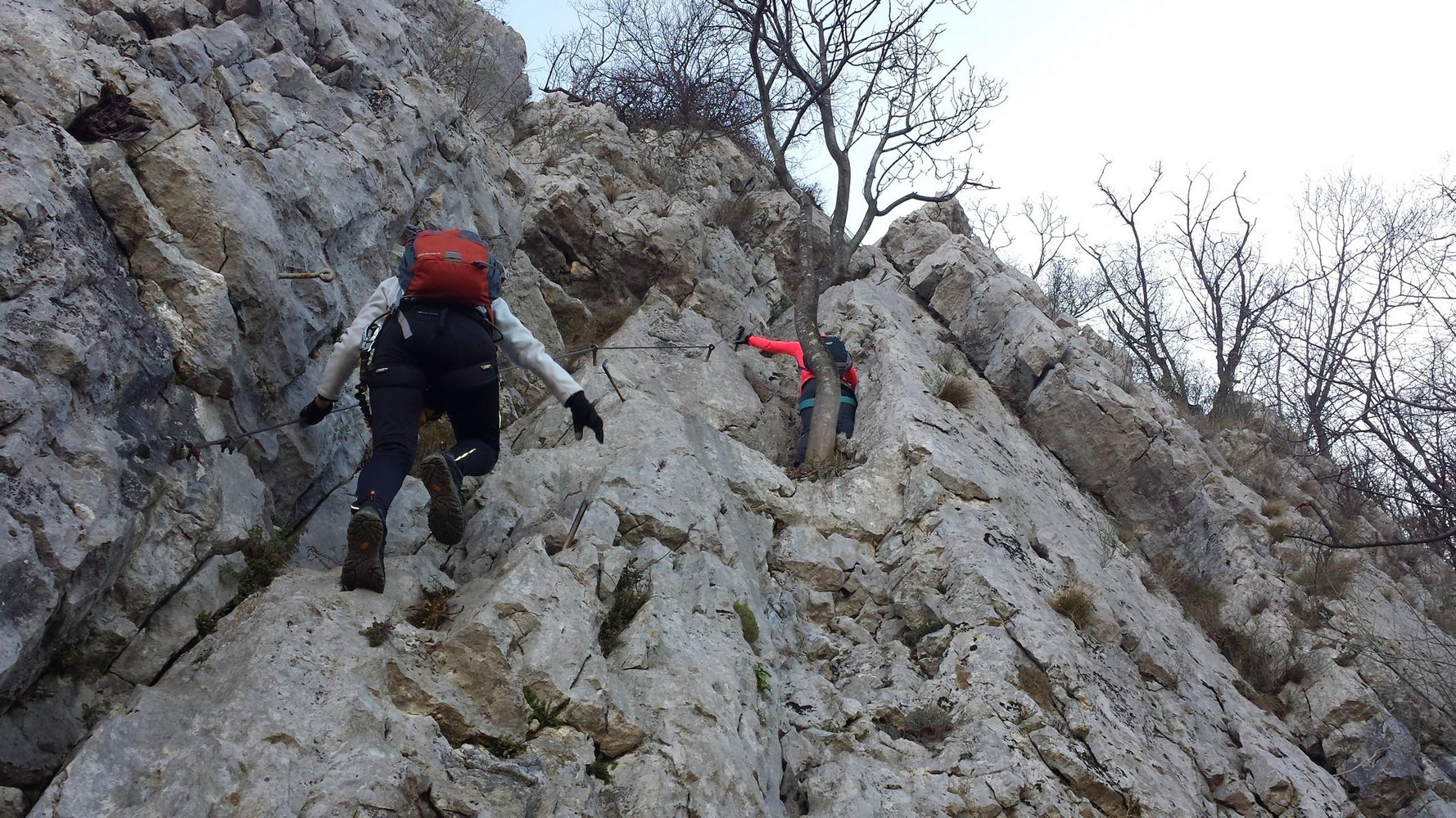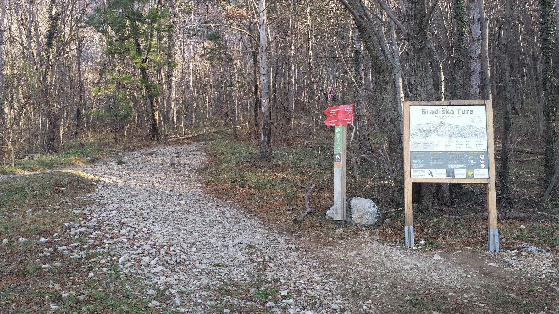 Der erste Klettersteig an der Gradiška Tura führt im linken Wandteil zu einer Plattform, von der aus man einen exzellenten Blick ins Vipava Tal hat, und geht dann über eine schöne Pfeilerkante zum Steigende in Wandmitte. Hier kann man entweder über den Normalweg in rd. 35 Min. zum Gipfel der Gradiška Tura aufsteigen, oder man steigt über den Normalweg kurz bis zum Einstieg der etwas schwierigeren Otmarjeva pot Ferrata ab und erklimmt über diesen Klettersteig den Gipfel.