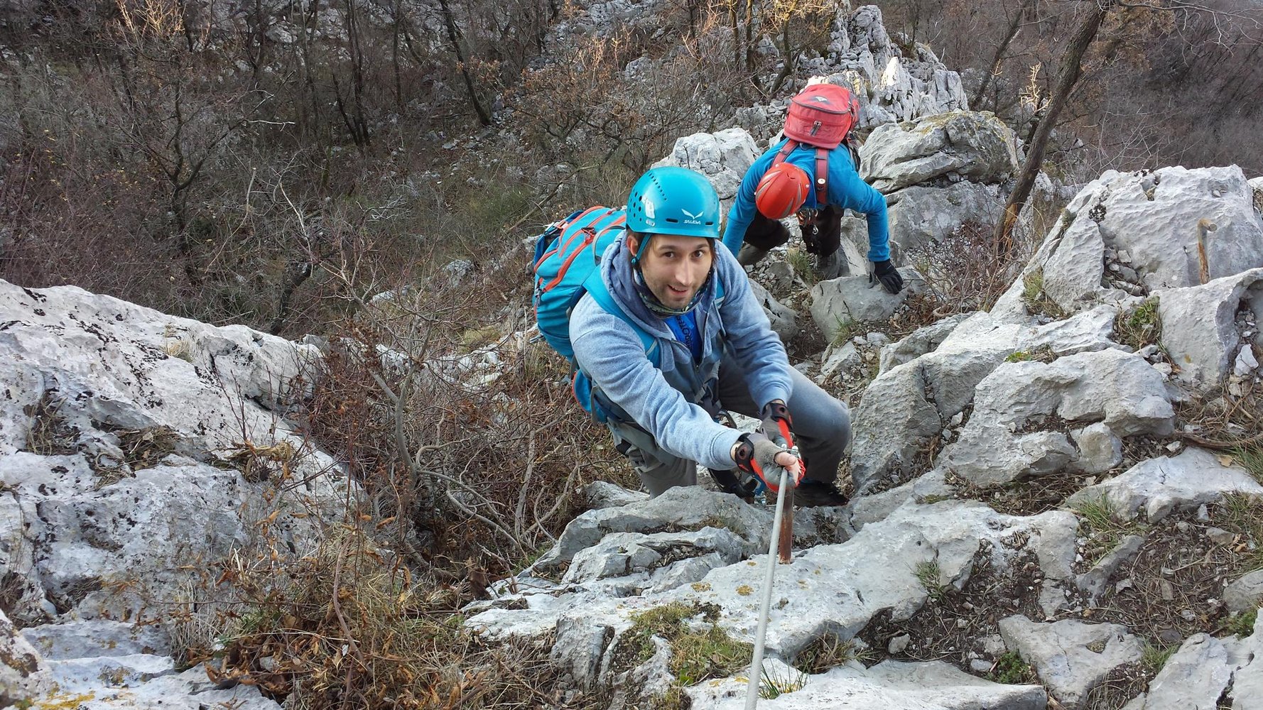 Die ersten vier Meter klettert man ungesichert (1) zum Seil hinauf.
