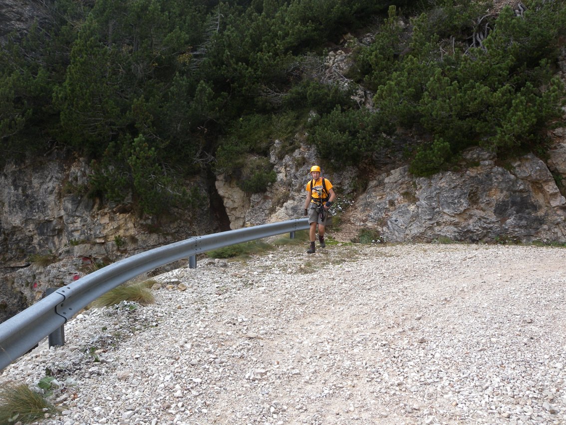 Vom Ausstieg rechtshaltend auf dem Latschenpfad (ausgeschnitten, markiert, tlw. versichert A) zu einer Schotterstraße und zurück zum Rifugio Pertica.