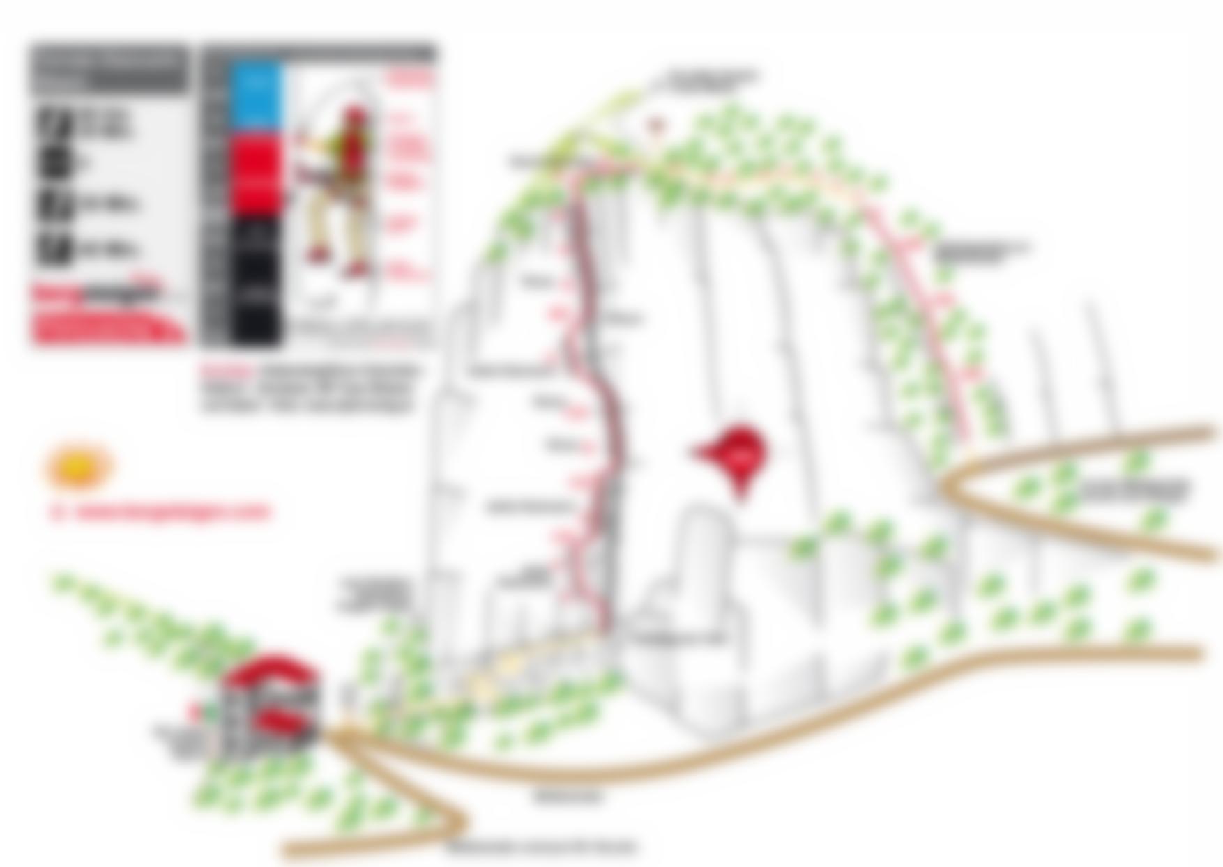 Siehe Topo. Vom Einstieg kurze Kletterei (1) bis zu den Drahtseilen, dann sehr steil (C) und überhängend (D) nach rechts in die Verschneidung (C/D). In dieser aufwärts (C) zu einer Steilpassage (D) und dann leichter (B/C und B) bis zum Ende der Route.
