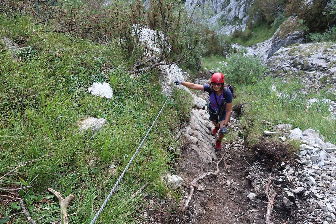 Eine kurze Stelle D, oft C/D, ein paar mal C, die unteren Hälfte des Klettersteiges ist einfacher.