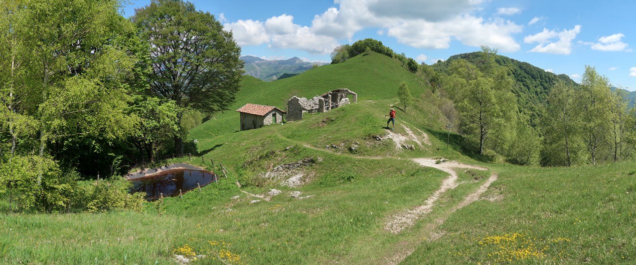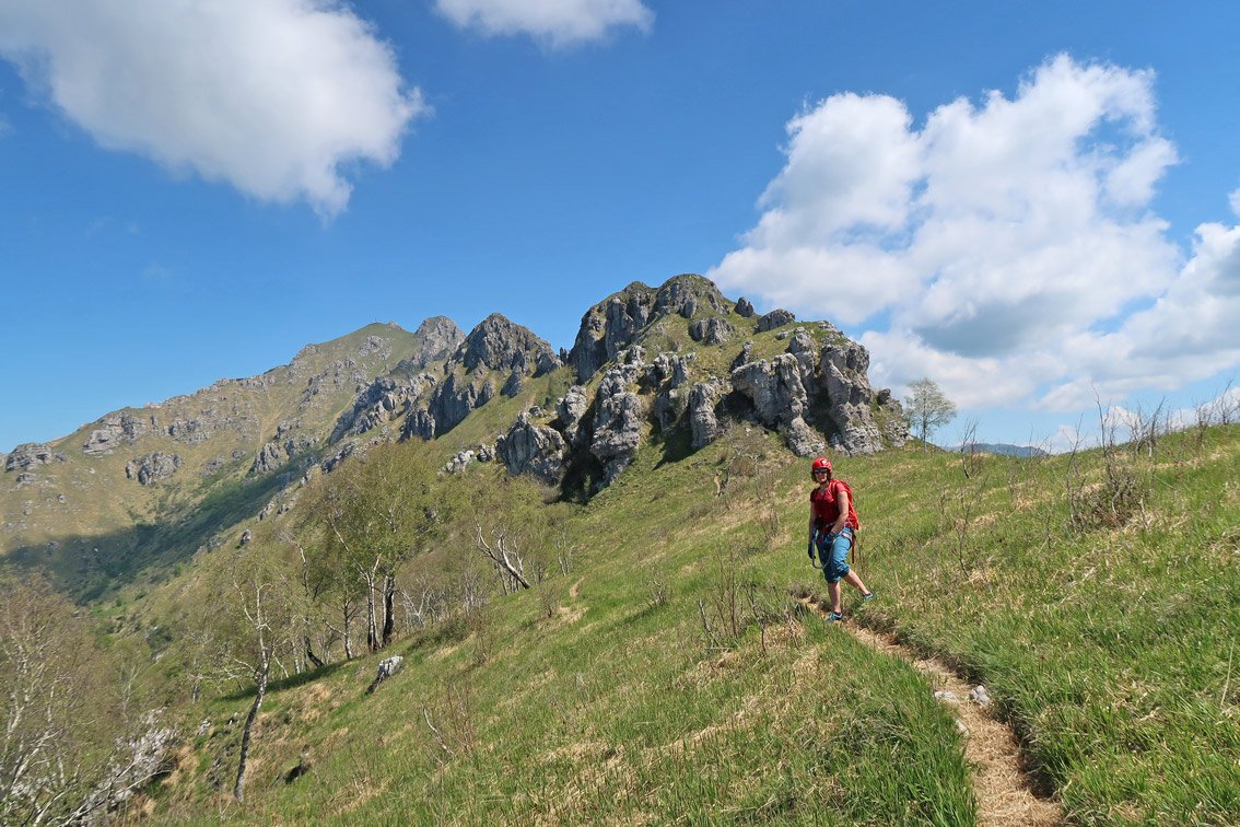 Den oberen langen Wiesengrat zurück – viele Klettersteigabschnitte können auf einem Pfad umgangen werden und unten auf dem steilen Pfad zwischen den Türmen hinunter zurück zur Parkmöglichkeit. Alternativ kann man vom Biwak zur Bocchetta di Desio absteigen und von dort rechts hinunter zur Asphaltstraße. Auf der Asphaltstraße dann retour (einige Kehren) zur Parkmöglichkeit an der Kante (der Abstieg zur Asphaltstraße ist nicht kürzer, aber sicher leichter als der Rückweg auf dem steilen Grat).