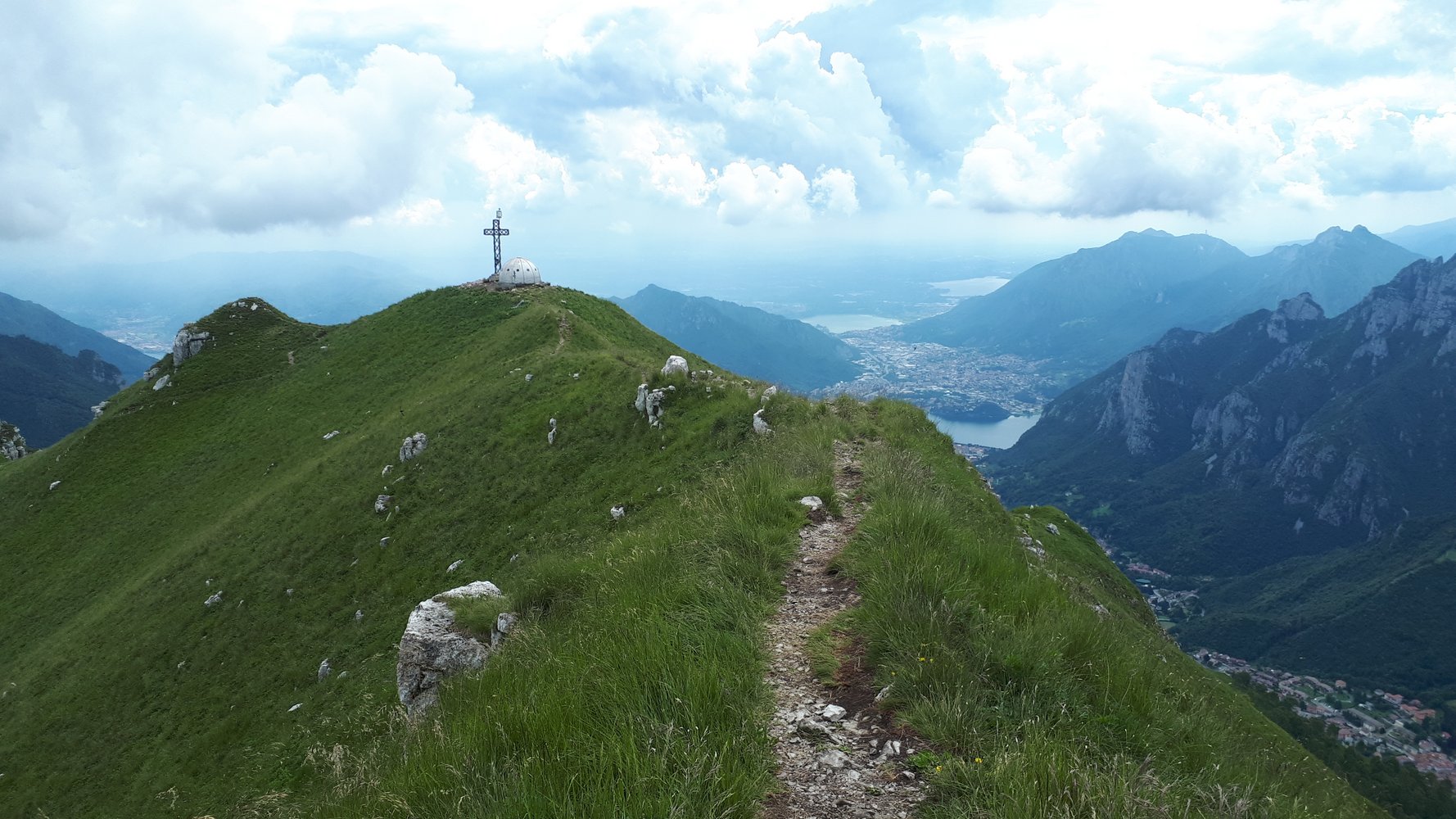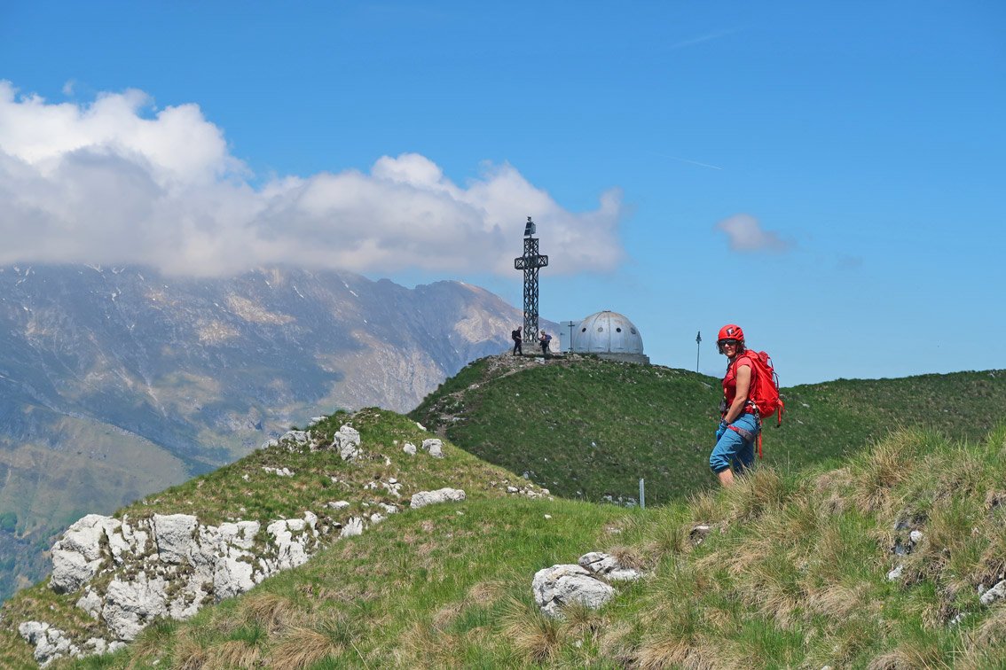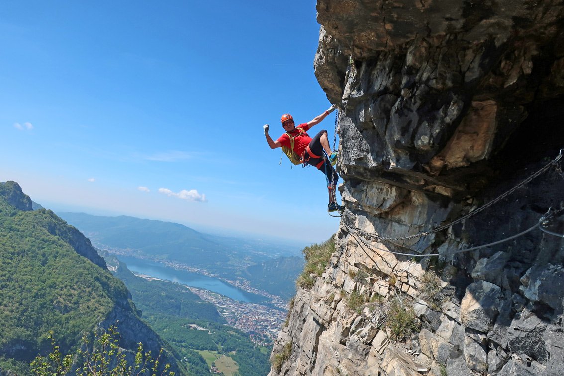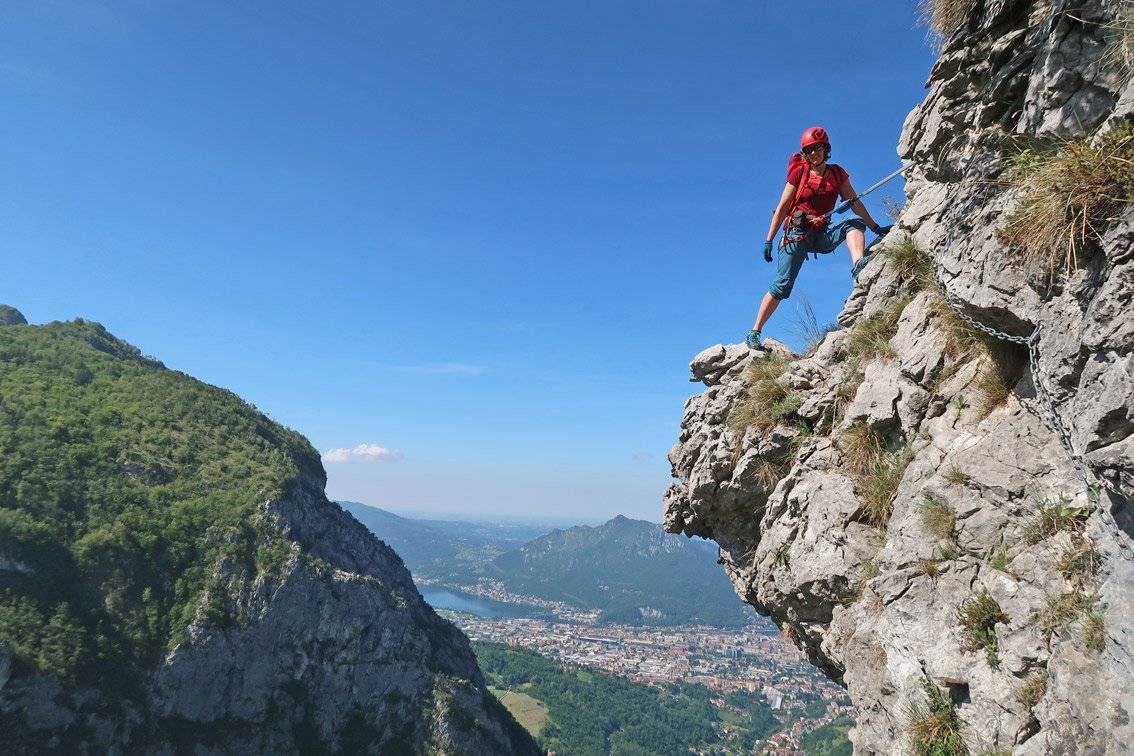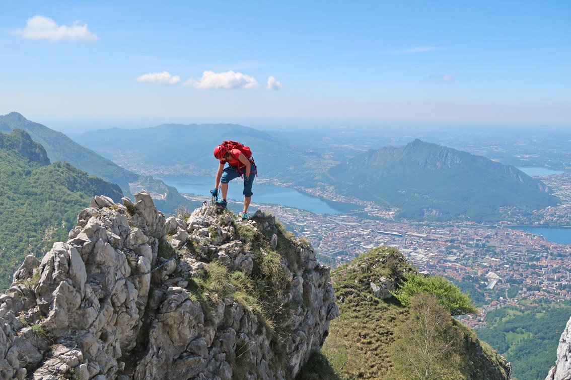 Direkt oberhalb von Lecco liegt der lange Wiesengrat, dessen höchster Punkt der Due Mani Gipfel ist. An der Südseite fällt der Grat steil, mit unzähligen kleinen Felstürmchen, direkt in Richtung Lecco ab – auf diesem Grat verläuft der eindrucksvolle Klettersteig. Ein stetiges Auf und Ab an den Felstürmen und einige Gehpassagen bei denen die Armmuskulatur etwas entlastet wird. Etwas oberhalb der Mitte kommt der Knackpunkt, der Turm mit dem Simone Contessi Klettersteig, an dem man sehr steil und mit viel Frischluft zu einem kleinen Wiesenplateau hinauf klettert. Am Ende dann der nicht enden wollende Wiesengrat – unterbrochen durch kurze, aber leichte Klettersteigaufschwünge – auf dem man den Gipfel mit dem Biwak erreicht. Gesamt ein toller, sehr abwechslungsreicher Klettersteig, der sicher zu den Highlights am Comer See gehört!