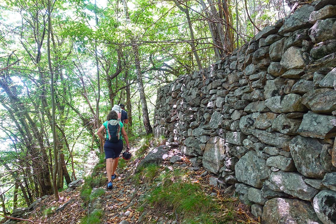 Vom Steigende hinauf zur Wiese neben dem Ort Daloo und nach rechts zum schon sichtbaren Aussichtspunkt. Beim Aussichtspunkt beginnt der Wanderweg zurück nach Pianazzola, auf dem man durch den Buschwald wieder bis zum Parkplatz absteigt.