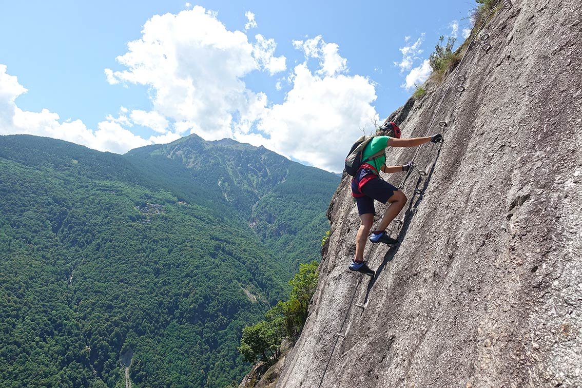 Die Pietro Biasini verläuft an einer steilen Felswand hoch oberhalb der Stadt Chiavana. Der Klettersteig ist recht gut mit Stahlseilen und sehr vielen Trittklammern ausgeführt, es macht Spaß, wie auf einer Leiter an der mächtigen Felswand höher zu steigen. Im Mittelteil der Felswand mündet die Ferrata in den Percorso Attrenzzato und man steigt entlang dieser einfachen Ferrata bis zum Bergdorf Daloo auf. Vom einem schönen Aussichtspunkt hat man einen perfekten Ausblick auf die Bergriesen im Bergell!