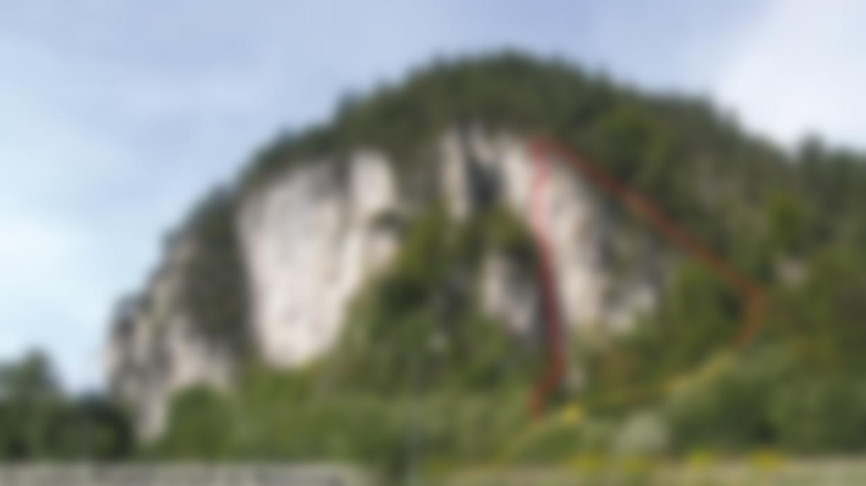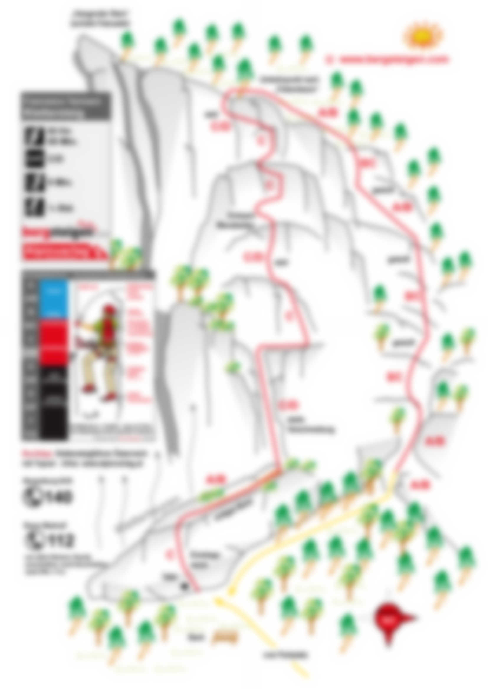 Nach der steilen Einstiegswand (C) folgt man einem erdigen Band (A/B) nach rechts.Anschließend führt eine steile Verschneidung (C/D) nach oben. Danach geht es im Zickzackkurs (C, dann C/D) weiter. Über die Schlusswand (C) wird der originelle Umkehrpunkt (C/D) erreicht.