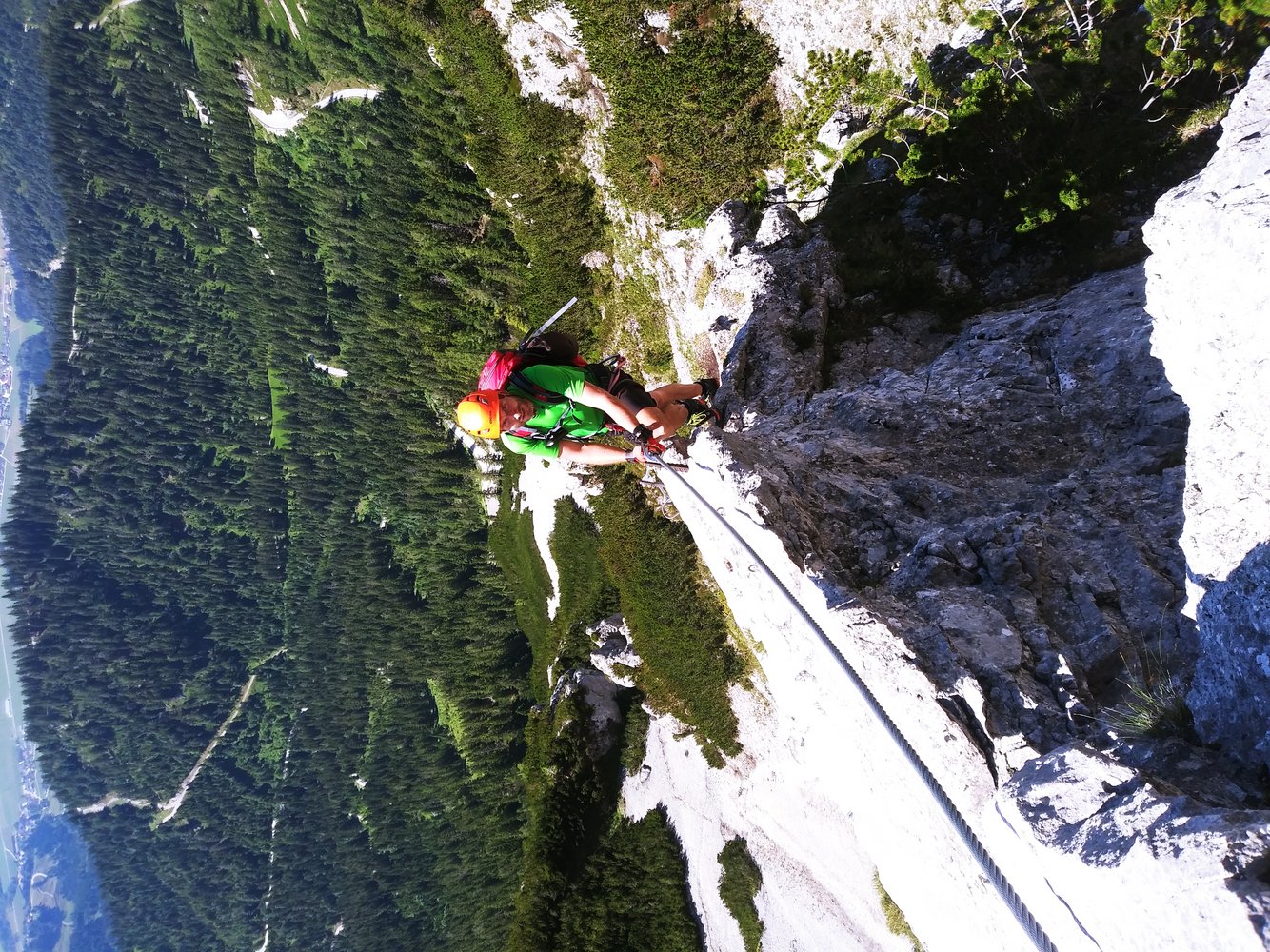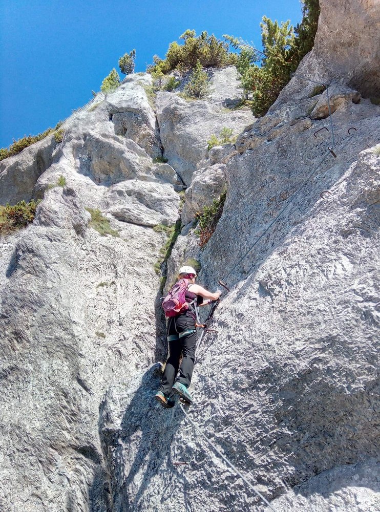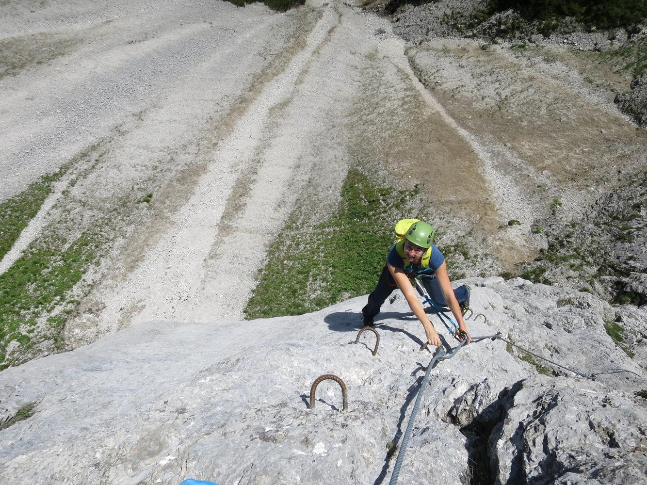 Achtung: Nach der ersten langen Querung zweigt im Steilaufschwung rechts der später dazugekommene Klettersteig Peter (150 Hm, 420m, B/C) ab.