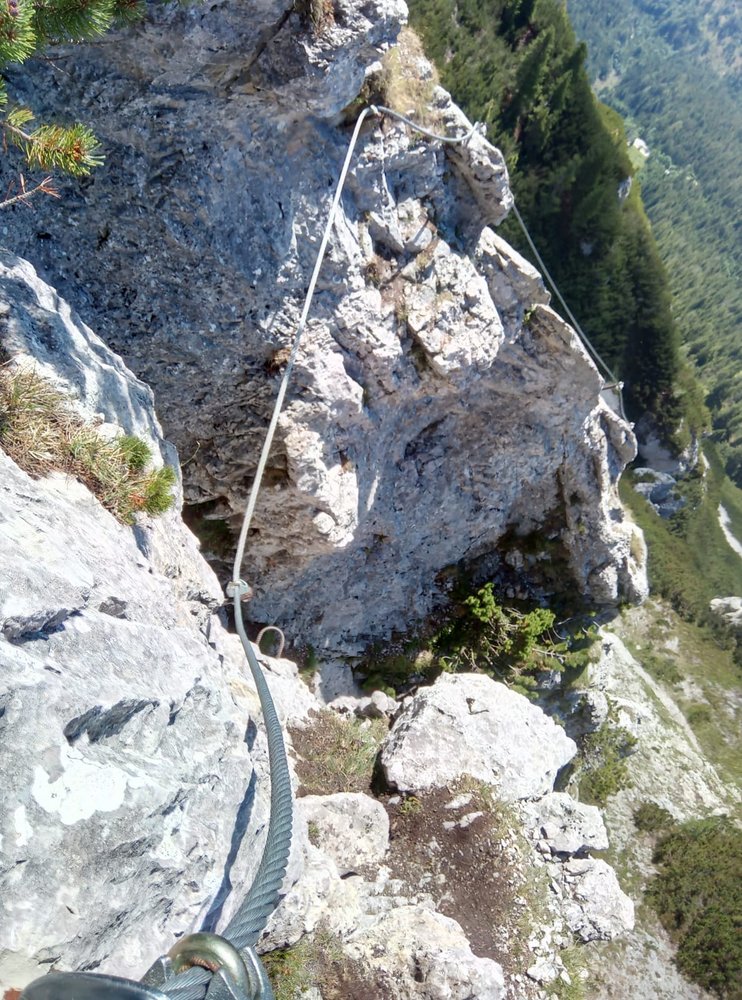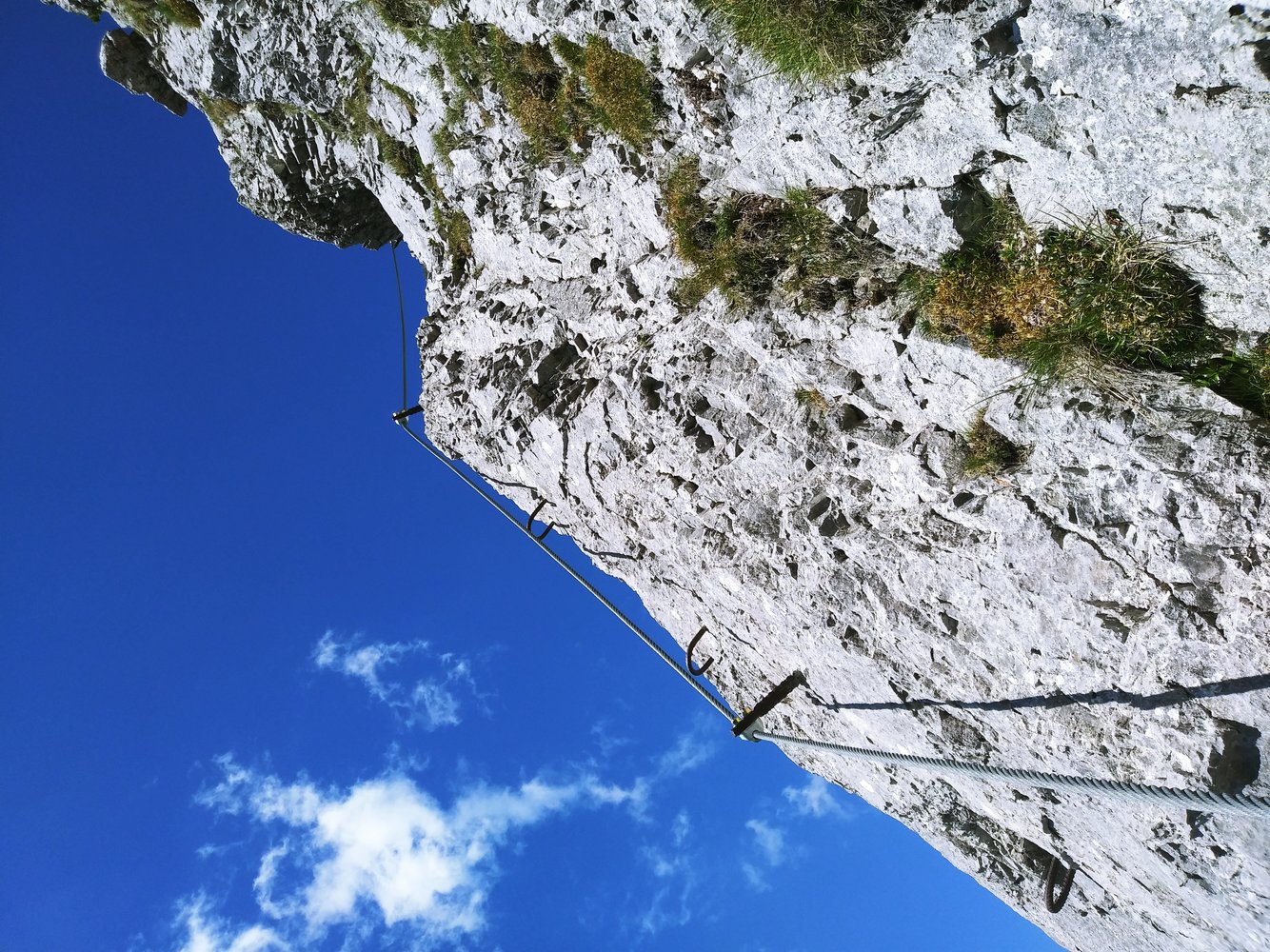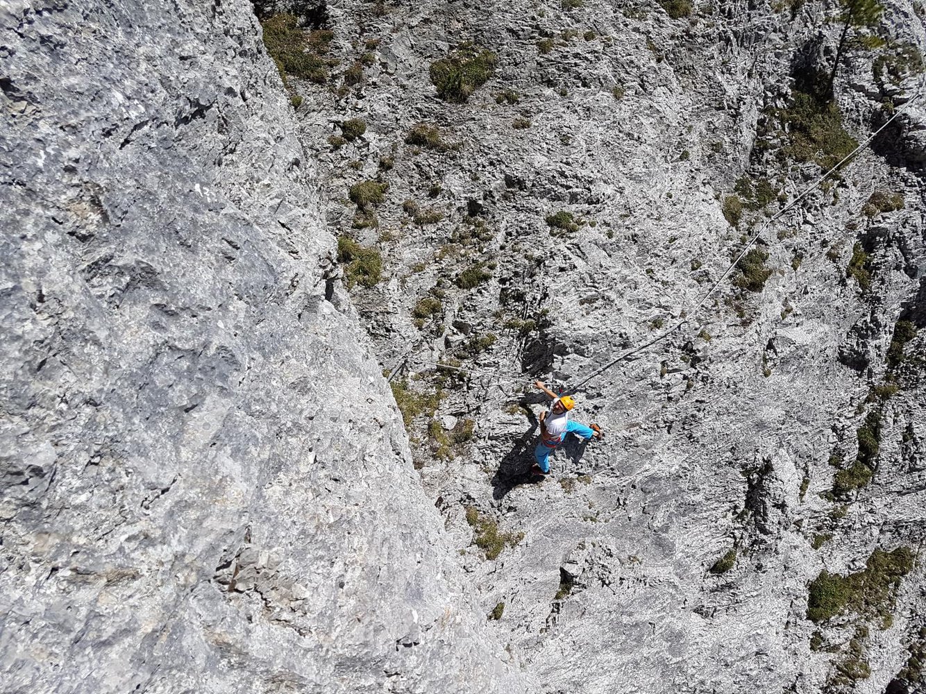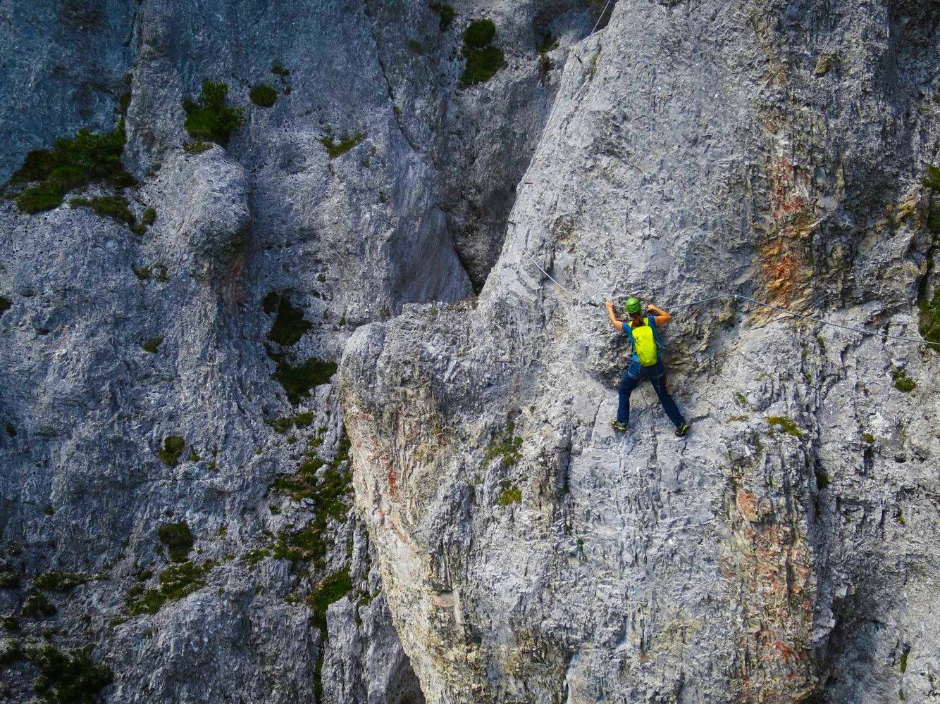 Achtung: Nach der ersten langen Querung zweigt im Steilaufschwung rechts der später dazugekommene Klettersteig Peter (150 Hm, 420m, B/C) ab.