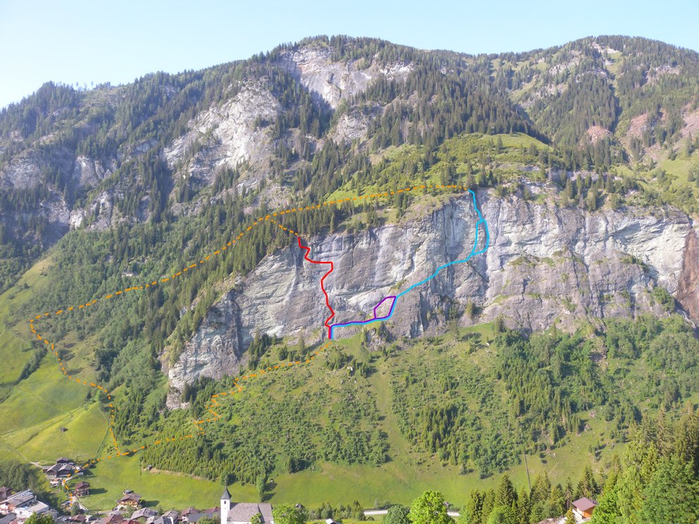 Achtung: Die rechte Linie bei der weißen Wand ist bei Nässe immer feucht, dann klettert man links (D/E) hinauf!