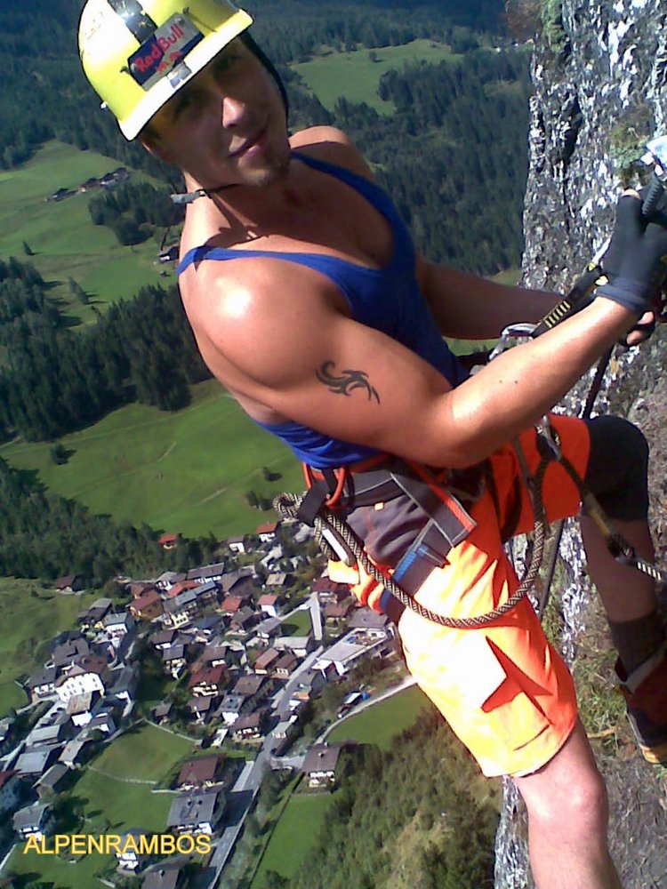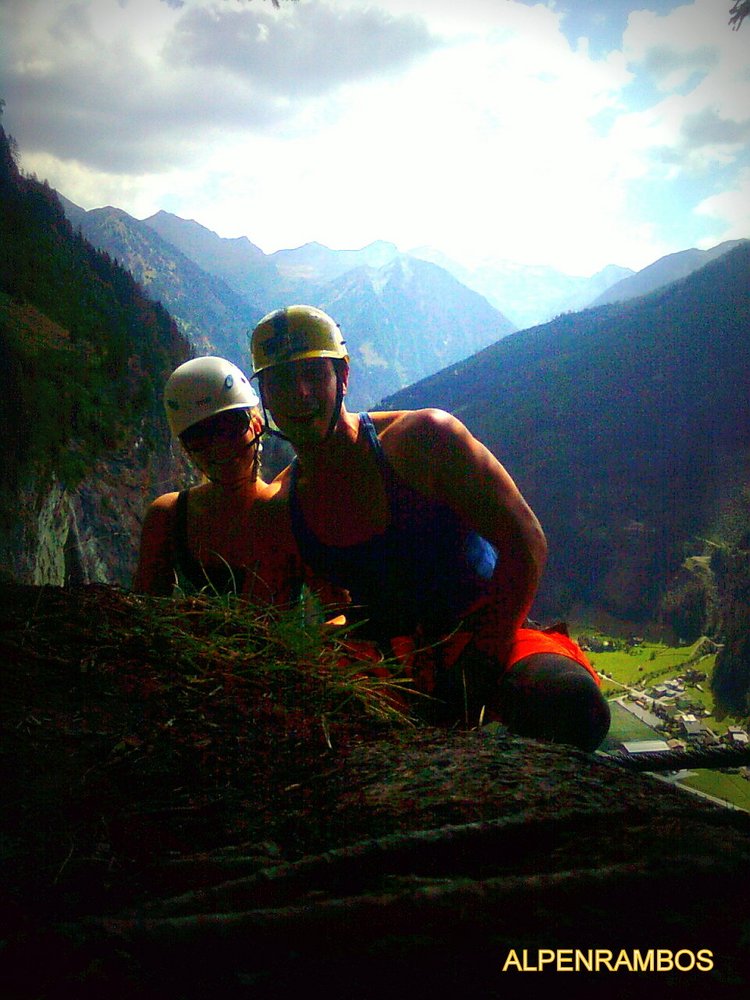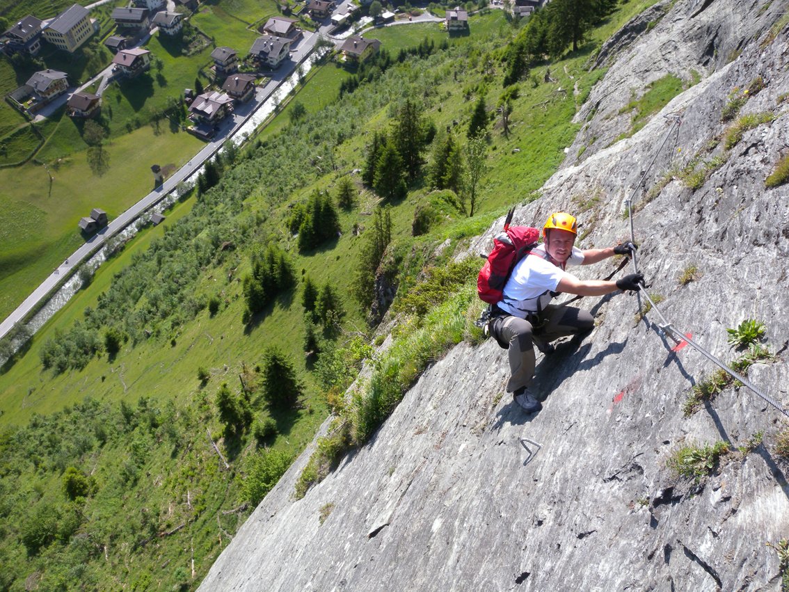 Komplettes Klettersteigset und Helm, für schwächere Geher ein Sicherungsseil.