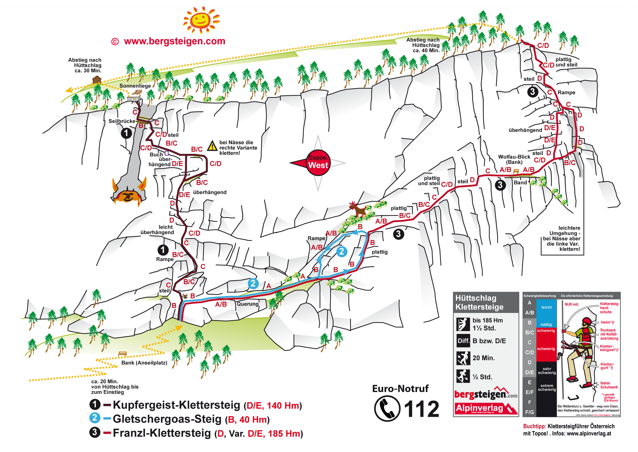 Vom Einstieg über eine leichte Platte (B) bis unter einen markanten Block (dort zweigt links der Kupfergeist-Klettersteig ab - siehe Topo). Man folgt dem Gletschergoas-Klettersteig nach rechts. Nach einer Wiesenpassage wählt man den zweiten "Aufstieg" und erreicht steiler (B) eine Verzweigung. Weiter nach rechts auf immer schwerer werdenden Platten aufwärts (B, dann C und kurz D). Man erreicht ein schmales Band (A/B) mit einer luftigen Bank. Am Ende geht es steil hinauf (C/D) bis zu einer weißen, überhängenden Wand. Davor zweigt man nach rechts (B/C) in eine Rinne und klettert steil (D) auf Platten höher, bis man wieder nach links quert (C). Die direkte Variante ist leicht überhängend (D/E). Nach der Vereinigung im grauen Fels wird die Tour wieder leichter (C und C/D). Man erreicht im Zickzak die Schlusswand, diese ist zu Beginn kurz steil (D), dann gelangt man aber leichter (C/D) zum Ausstieg bei einem mächtigen Baum.