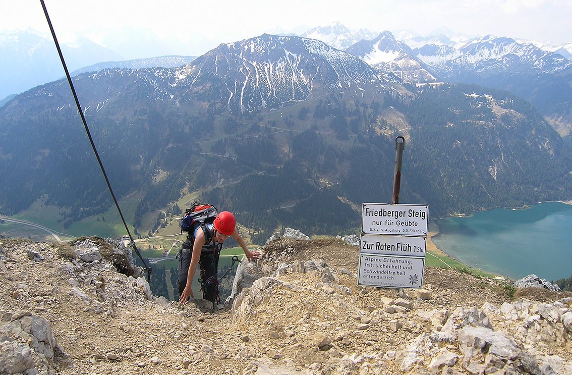 Der landschaftlich sehr eindrucksvolle Friedberger Klettersteig in den Tannheimer Bergen ist eine beliebte „Testtour“, um etwas ausgesetzter die Rote Flüh zu besteigen. Meist wird der Steig vom Schartschrofen aus gemacht - dabei klettert man die schwere Stelle im Abstieg, auch die umgekehrte Richtung vom Gimpelhaus ist sehr beliebt. Vom Gipfel hat man einen tollen ausblick auf den Haldensee und auf den direkt daneben stehenden Gimpel.