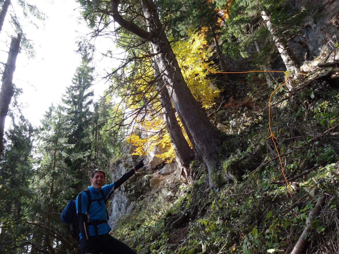 Vom Parkplatz der Roten Wand auf Forststraße in Richtung Buchebensattel, in der ersten Kehre auf gut sichtbaren Steigspuren nach rechts in einem Graben zur nächsten Forststraße aufwärts, dieser nach rechts folgen und auf dem markierten Wanderweg Richtung Tyrnaueralm, bis dieser noch im Wald auf einem Rücken unter dem Gipfel der Roten Wand führt, der Weg geht noch kurz den Rücken hinauf und verlässt diesen bei einer gelben Tafel nach rechts. Hier genau bei einem gelben Wegweiser den Wanderweg verlassen und auf einem Pfad dem Rücken weiter aufsteigen. Es kommt eine Forststraße und gleich (der weg ist links) darüber eine Wiese. Kurz am Wiesenrücken zur Wand hinauf und vor dem Wald rechts einem Weg folgen. Bei einigen Felsblöcken + Steinmann, zweigt links der Weg zum Einstieg ab.