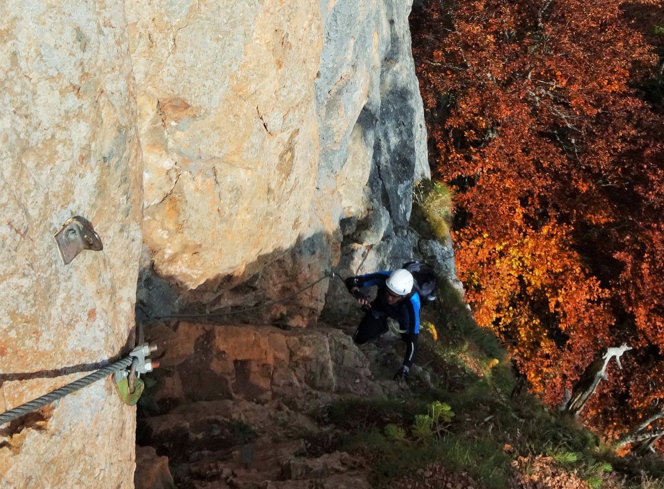 Der Klettersteig führt durch die Gipfelwand der Routen Wand direkt zum höchsten Punkt. Das Frohnleitnerband wurde 1987 erstbegangen, es handelt sich quasi um einen Selfmade-Klettersteig. Zuletzt machten zahlreiche Gerüchte und Schauergeschichten über den Zustand dieser Ferrata die Runde. Der Anstieg verläuft in spannender Routenführung unterhalb des Gipfelkreuzes durch die langgezogene Rote Wand. Der Steig war anfangs schlecht versichert, wurde dann sogar abgebaut und zuletzt wieder saniert. 2022 hat der Steig einen neuen Einstieg bekommen und die Bäume im Einstiegsbereich wurden gefällt, sodass man den Steig jetzt auch leichter findet. 2025 wurde eine Umgehungsvariante zur Schlüsselstelle hinzugefügt. Achtung: Beim Ausstieg müssen einige Meter im steilen Gelände ungesichert überwunden werden!