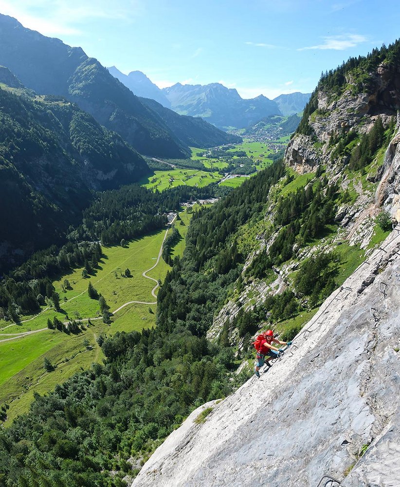 „Stairway to heaven“ wird dieser Klettersteig im lokalen Klettersteigfolder genannt. Zu Recht, denn er ist sicherlich das Highlight im Klettersteig-Eldorado- Engelberg. Kein anderer der fünf Steige, in der zwischen Bergriesen eingebetteten Enklave, kommt der Fürenwand-Ferrata an Steilheit und Schwierigkeit gleich - zu kompakt ist der Fels in der 600 Meter hohen Fürenhochflue. Der Steig ist konstant schwierig und hat am Ende ein Highlight, eine knapp 30 Meter hohe und leicht überhängende Strickleiter. Die Tour ist zwar talnah und hat eine gute Seilbahnanbindung, dennoch sollten Anfänger und Höhenängstliche die Finger davon lassen, denn man braucht eine große Portion Armkraft und eine stabile Psyche, um den Aufstieg an den hunderten Trittstiften durch die senkrechte Wand auch richtig genießen zu können. Es gibt keinen Fluchtweg auf der gesamten Strecke, doch zurückschauen lohnt sich beim Klettern allemal, da man die imposante Nordwand des Titlis (3238 m) stets im Rücken hat.