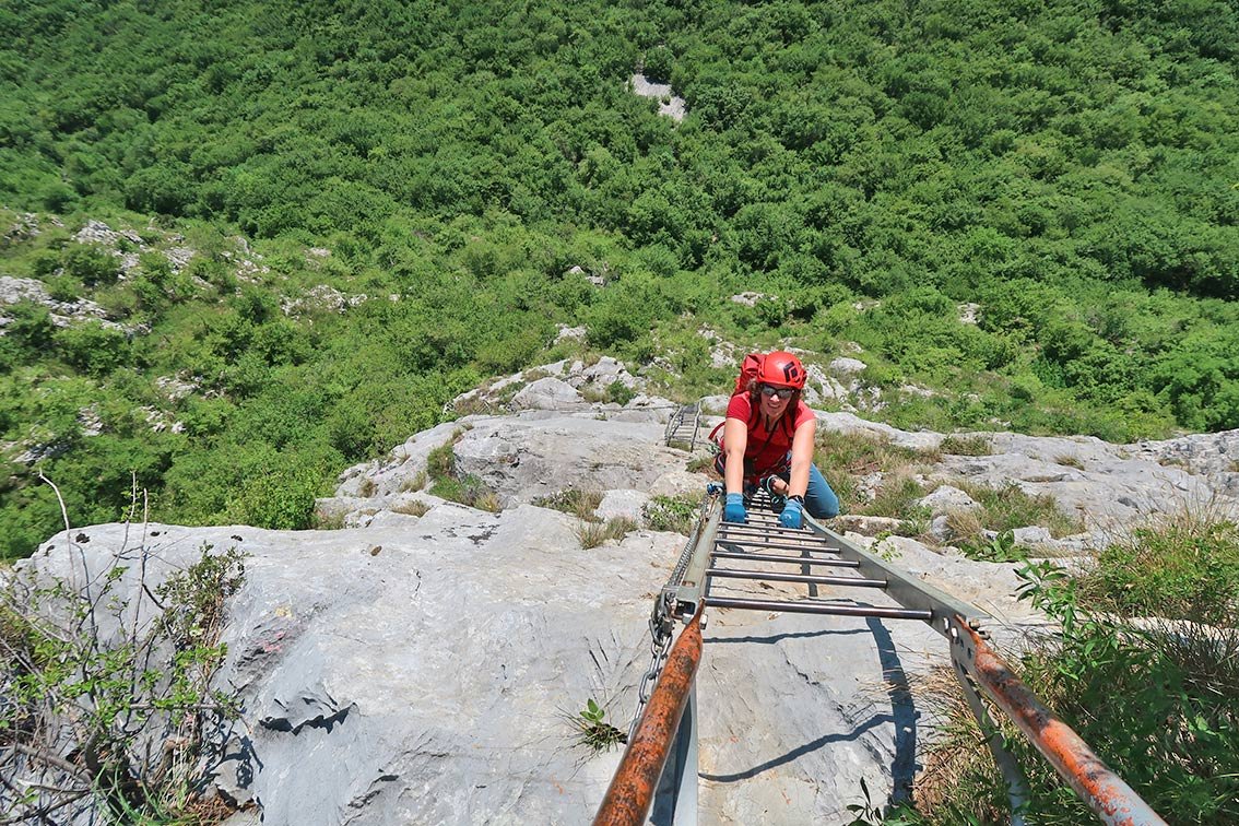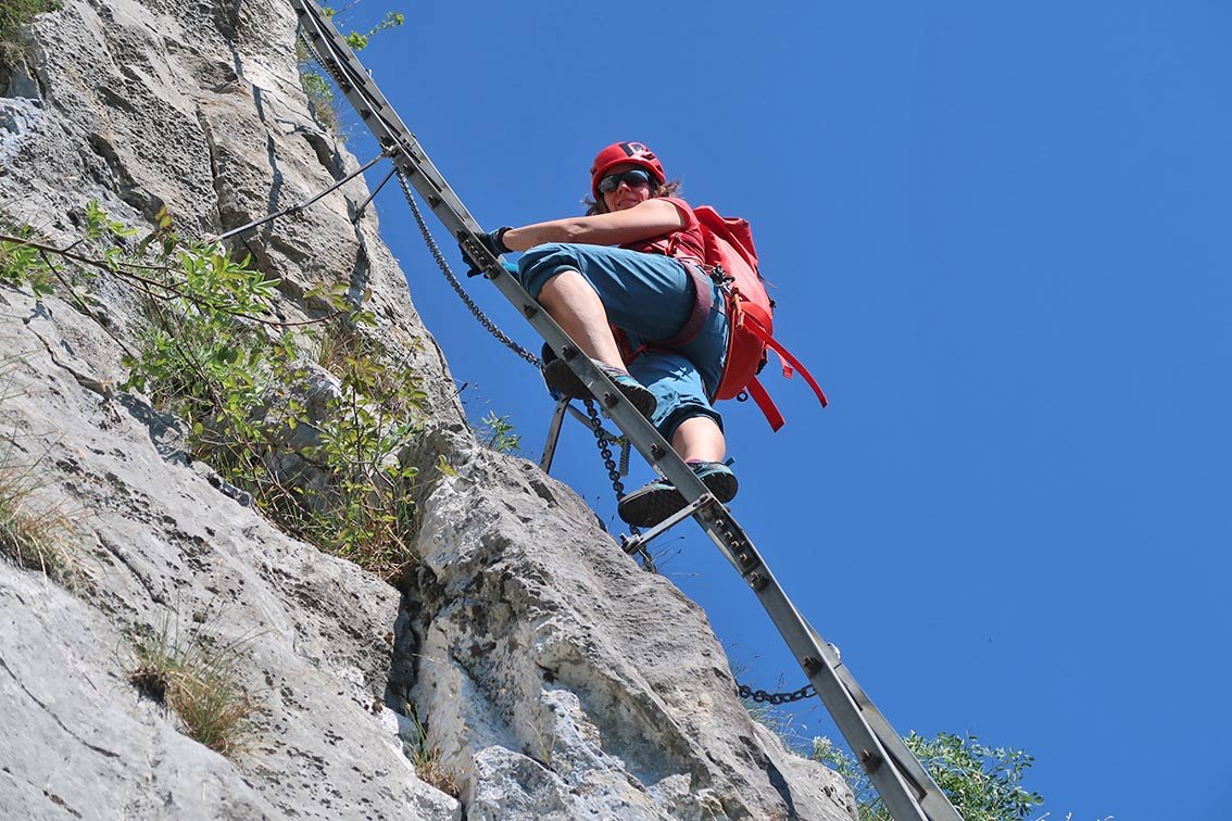 Sehr schöne Leitern-Ferrata an der Südwestkante des Pizzo d’Erna. In dieser Ferrata sind neben den - teilweise sehr ausgesetzten - 22 Leitern auch eine Zweiseilbrücke und eine Eisenbrücke. Man kommt sich vor wie ein Feuerwehrmann, wenn man an der 18 m-Leiter nach oben klettert, dieses Erlebnis wird bei der oft herrschenden Hitze um einiges intensiviert (die Eisenleitern sind dann brennheiß)!