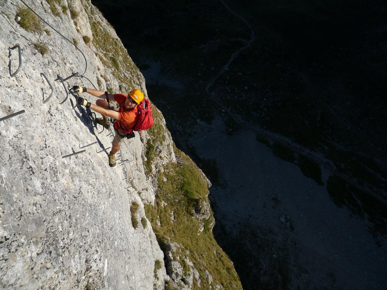 Komplette Klettersteigausrüstung, Helm und Klettersteighandschuhe – für Schwächere ist evtl. die Mitnahme eines Sicherungsseiles sinnvoll!