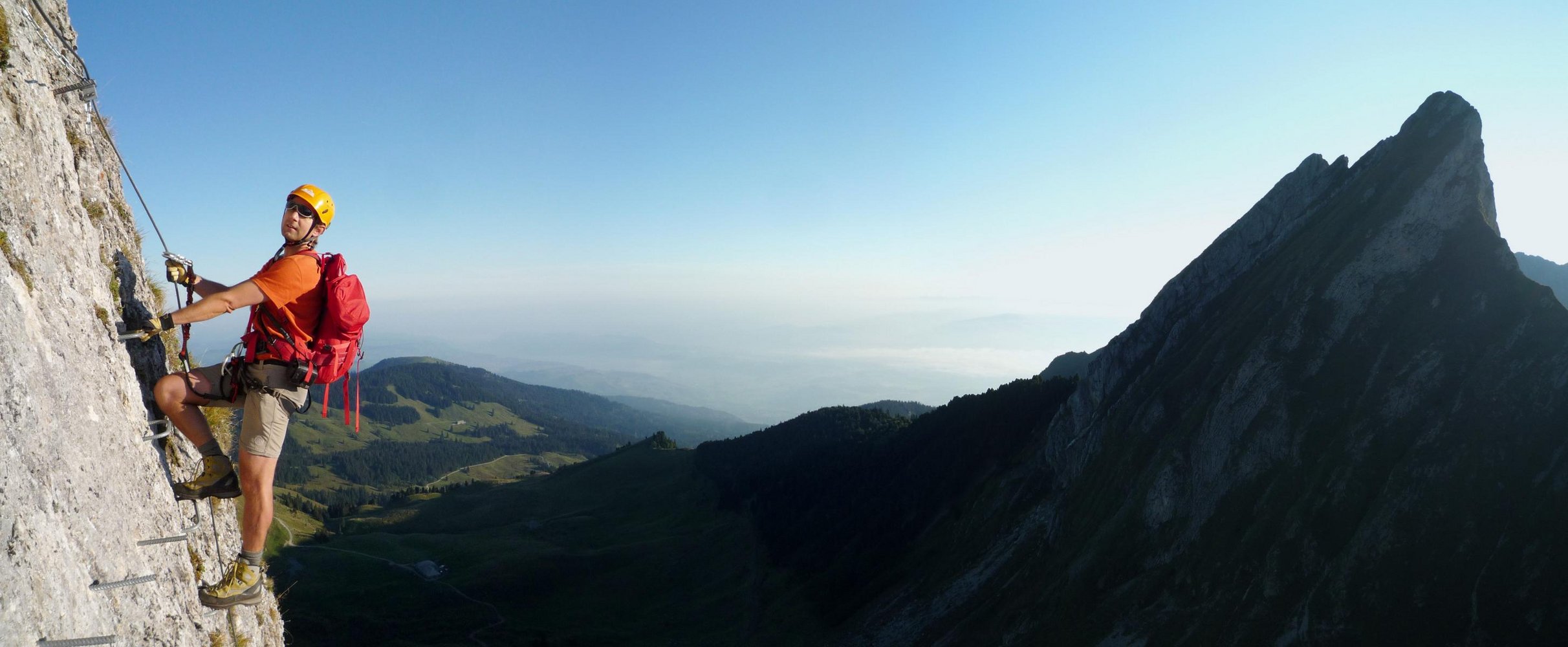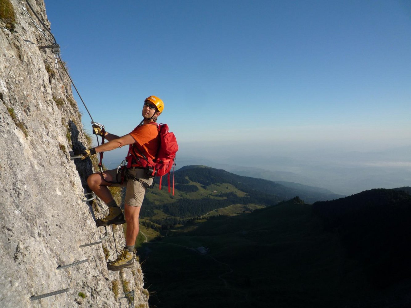 Der Klettersteig auf den Gantrisch wurde am 07.07.2007 eröffnet. Ob dieses Datum bewusst gewählt wurde ist den Autoren nicht bekannt, aber wahrscheinlich. Schließlich gilt die Ziffer Sieben in vielen Kulturen als Glückszahl. Und Glück braucht man auch, wenn man an einem Schönwetterwochenende nicht im Stau beim Einstieg stehen will. Die große Beliebtheit des Klettersteigs ist absolut berechtigt. Die Erbauer haben die Route im französischen Stil mit vielen Klammern, ein paar Leitern und einem locker gespannten durchlaufenden Stahlseil eingerichtet. Von einigen Autoren wird die Horber-Kante zum Schluss als Schlüsselstelle genannt. Wir schließen uns dieser Meinung nicht an, denn auch das Küre-Wändli und der Einstiegspfeiler weisen ähnlich anspruchsvolle Stellen auf. Trüb sollte das Wetter nicht sein, denn dann entgeht einem der tolle Rundumblick vom Gipfel. Das Panorama reicht von den Juraketten im Norden bis zu den berühmten Viertausendern der Berner Alpen im Süden.