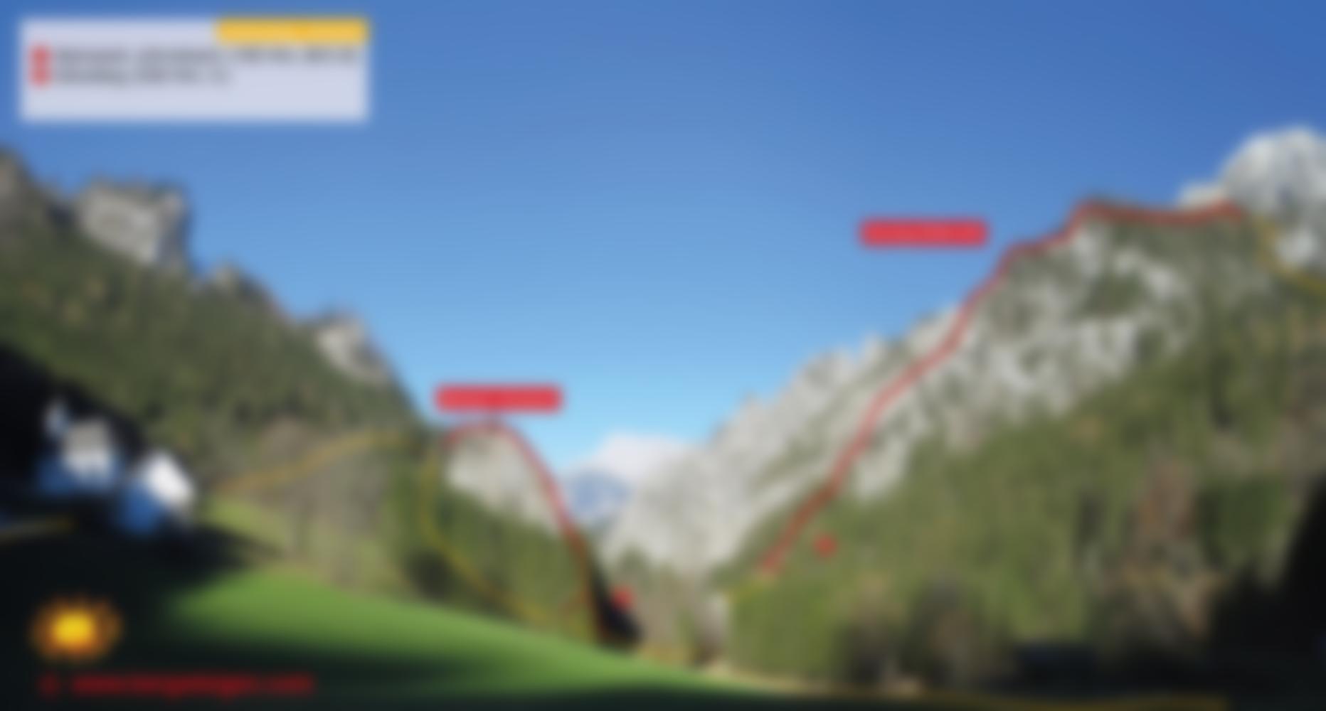 Vom Ausstieg auf dem markierten weg (eine Stelle versichert, A) nach Johnsbach absteigen und auf der Straße zurück zum Ghf. Donner. Tipp: Er hat eine sehr gute Küche.