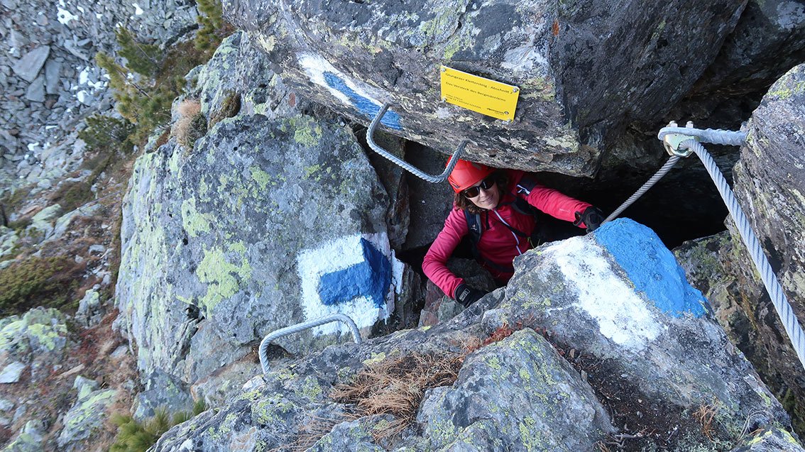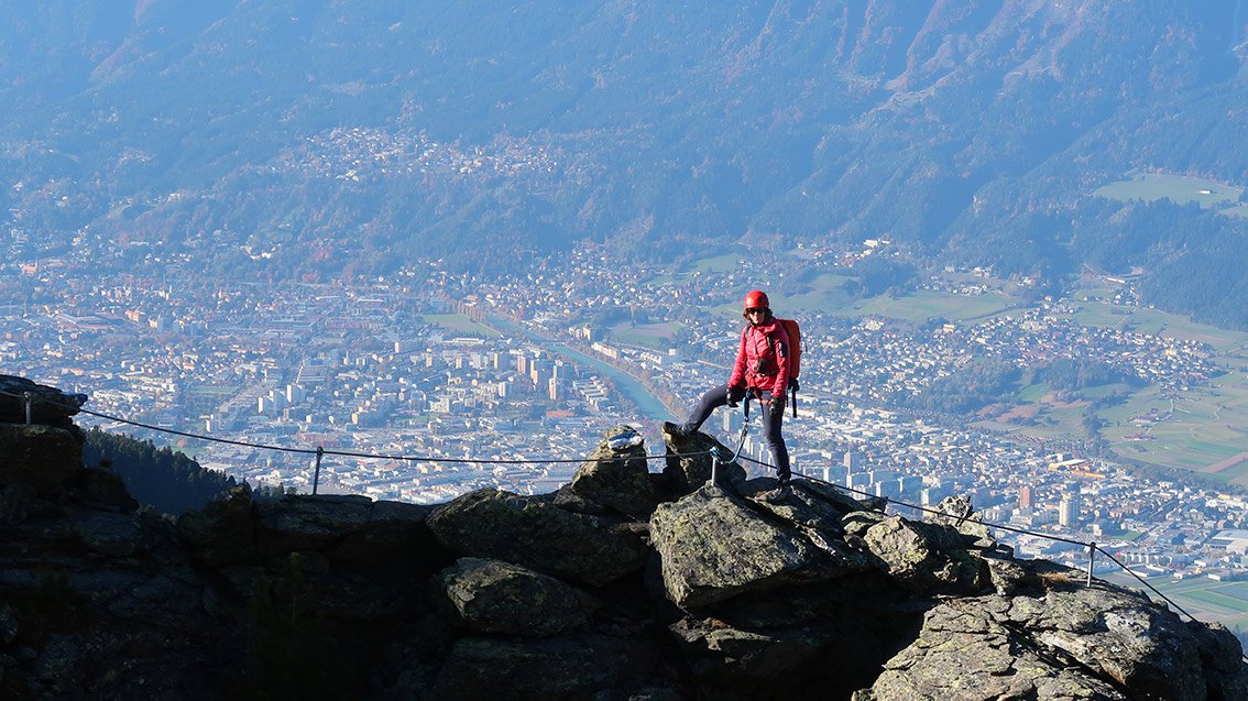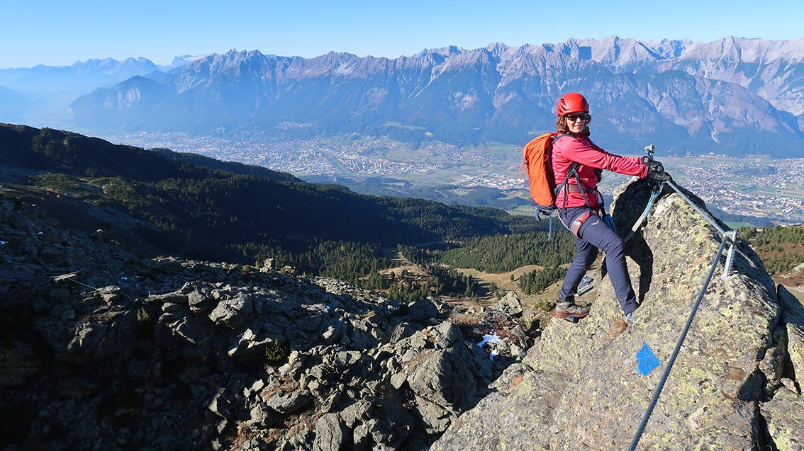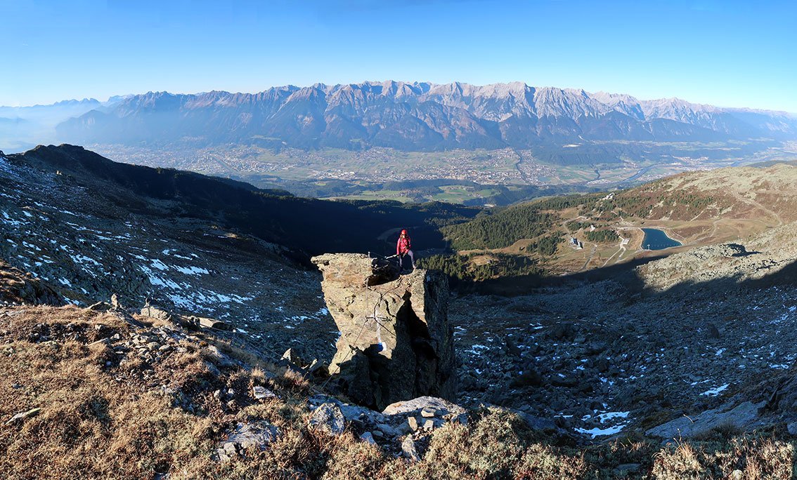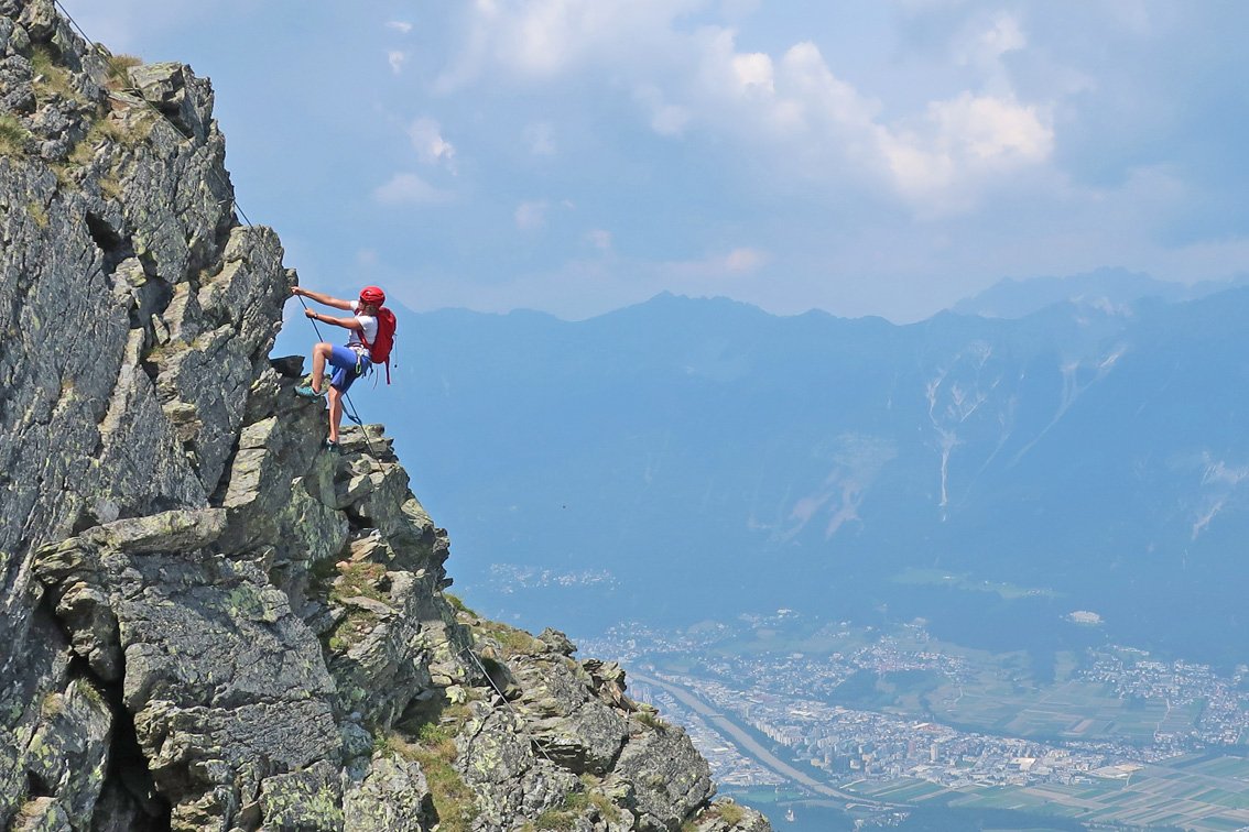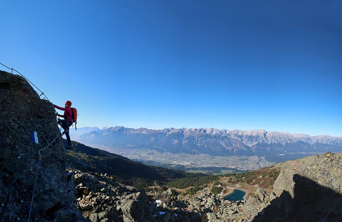Walking over Karwendel - der alte Glungezer-Klettersteig wurde sehr ansprechend revitalisiert! Es wurden neue Seile gespannt, Stationen mit Bezug auf die Sage „Der Riese vom Glungezer“ (Krone, Hammer, Labyrinth, Tunnel ...) geschaffen und - als absolutes Highlight - eine gewaltige Nepal-Brücke montiert. Die ehemaligen C-Passagen wurden mit Klammern entschärft. So entstand ein anregender Genussklettersteig mit toller Aussicht auf das Inntal.