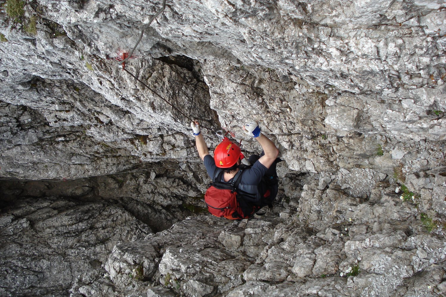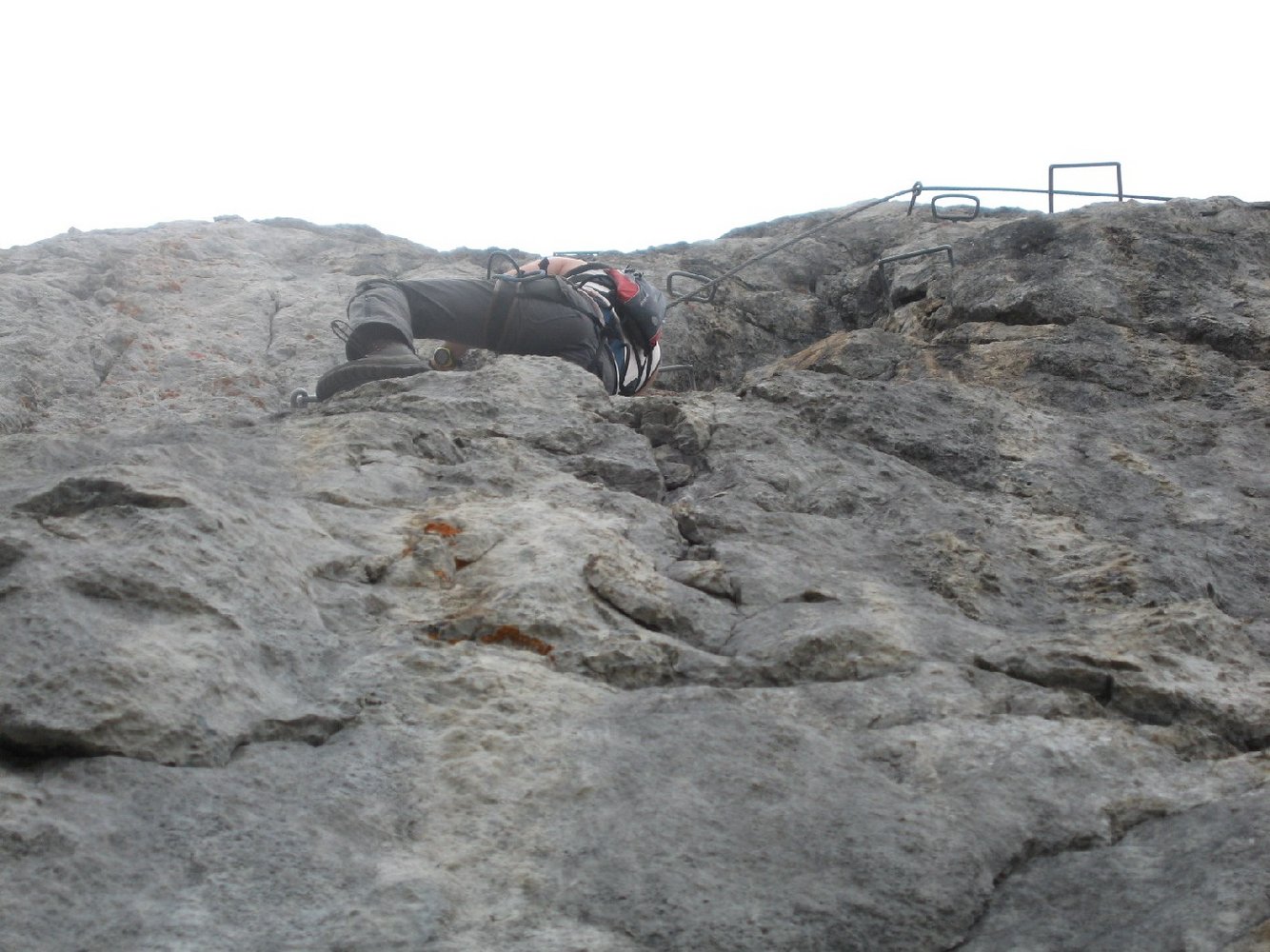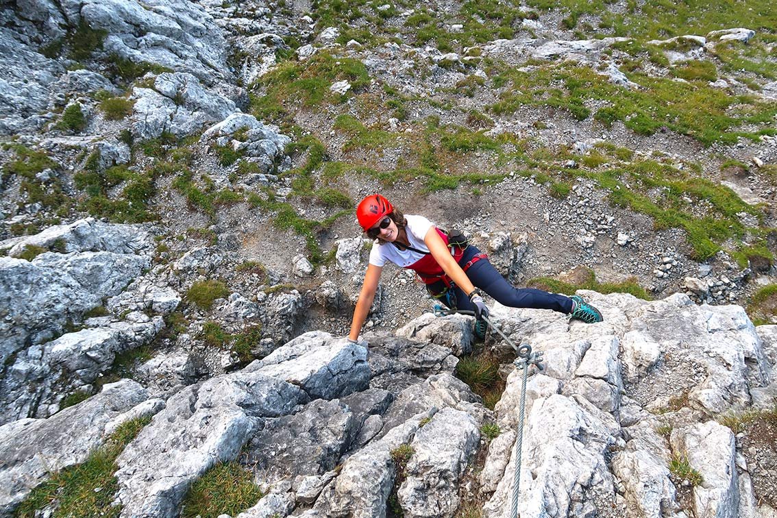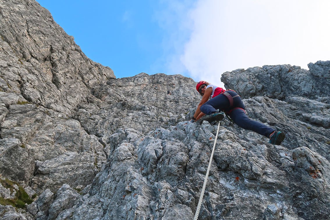 Klettersteig-Grundausrüstung, Klettersteighandschuhe und Helm. Für Kinder u. Anfänger nicht zu empfehlen bzw. um bedingt Sicherungsseil erforderlich!