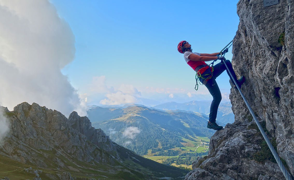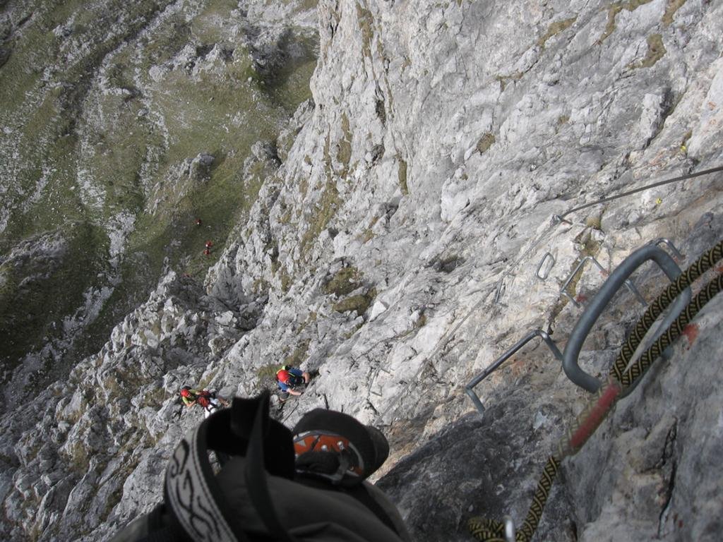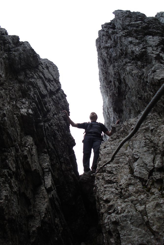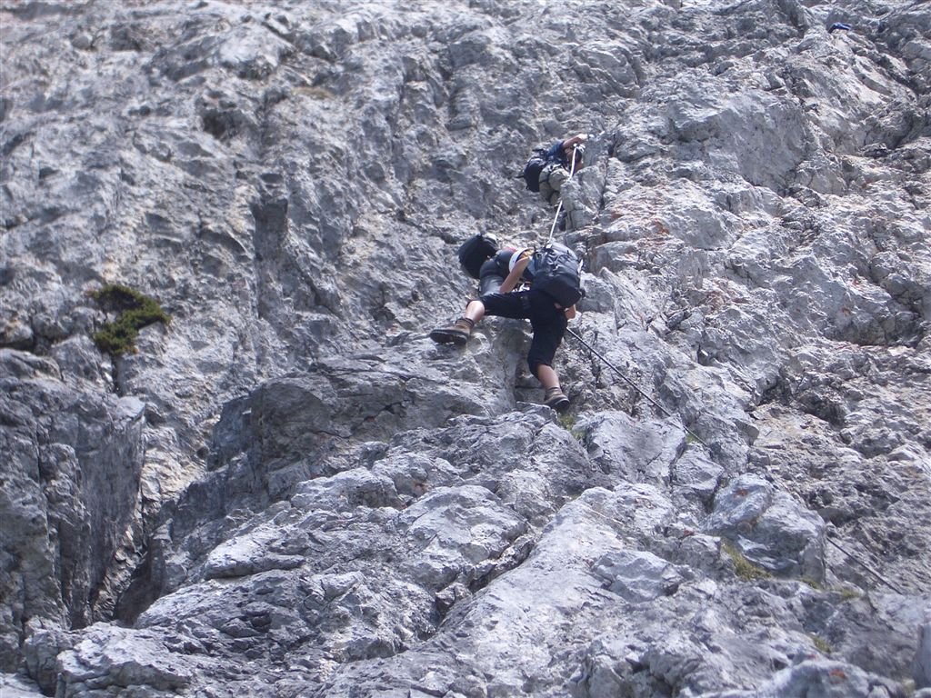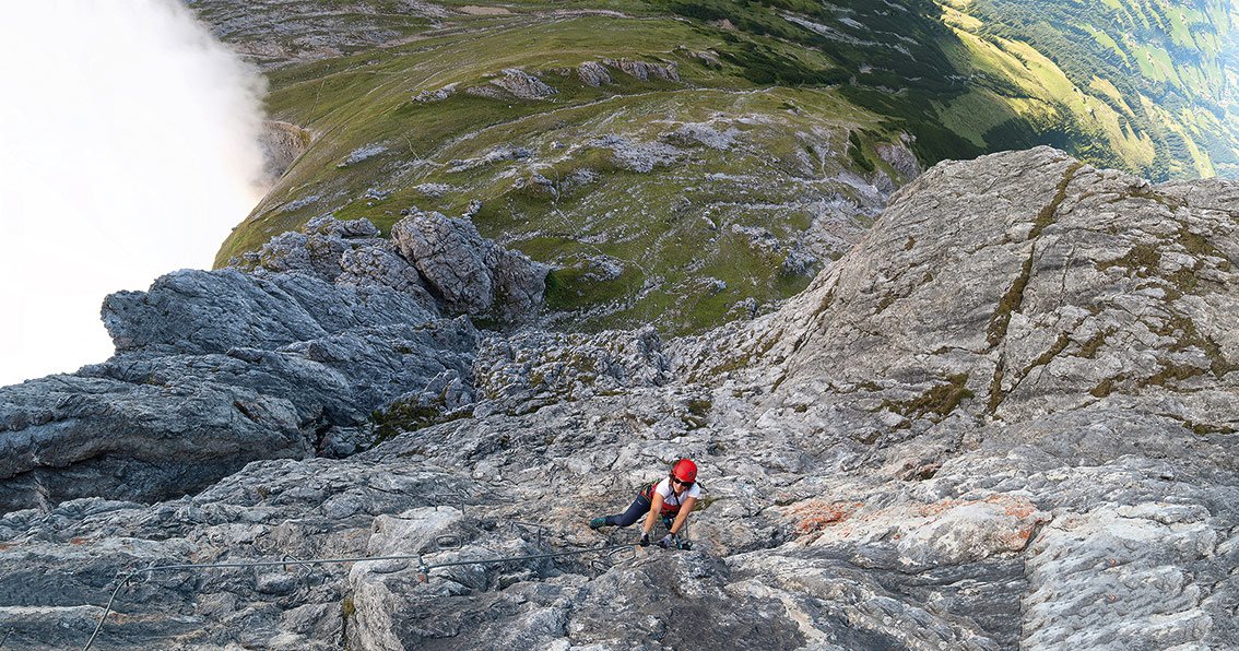 Klettersteig-Grundausrüstung, Klettersteighandschuhe und Helm. Für Kinder u. Anfänger nicht zu empfehlen bzw. um bedingt Sicherungsseil erforderlich!
