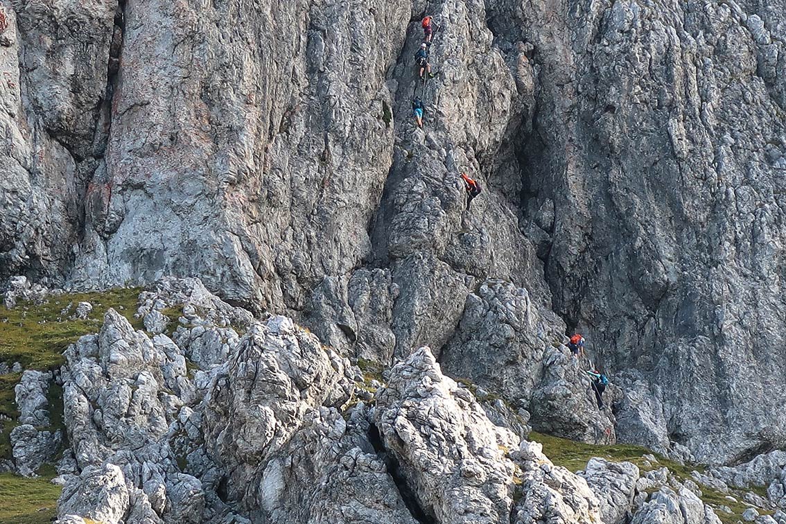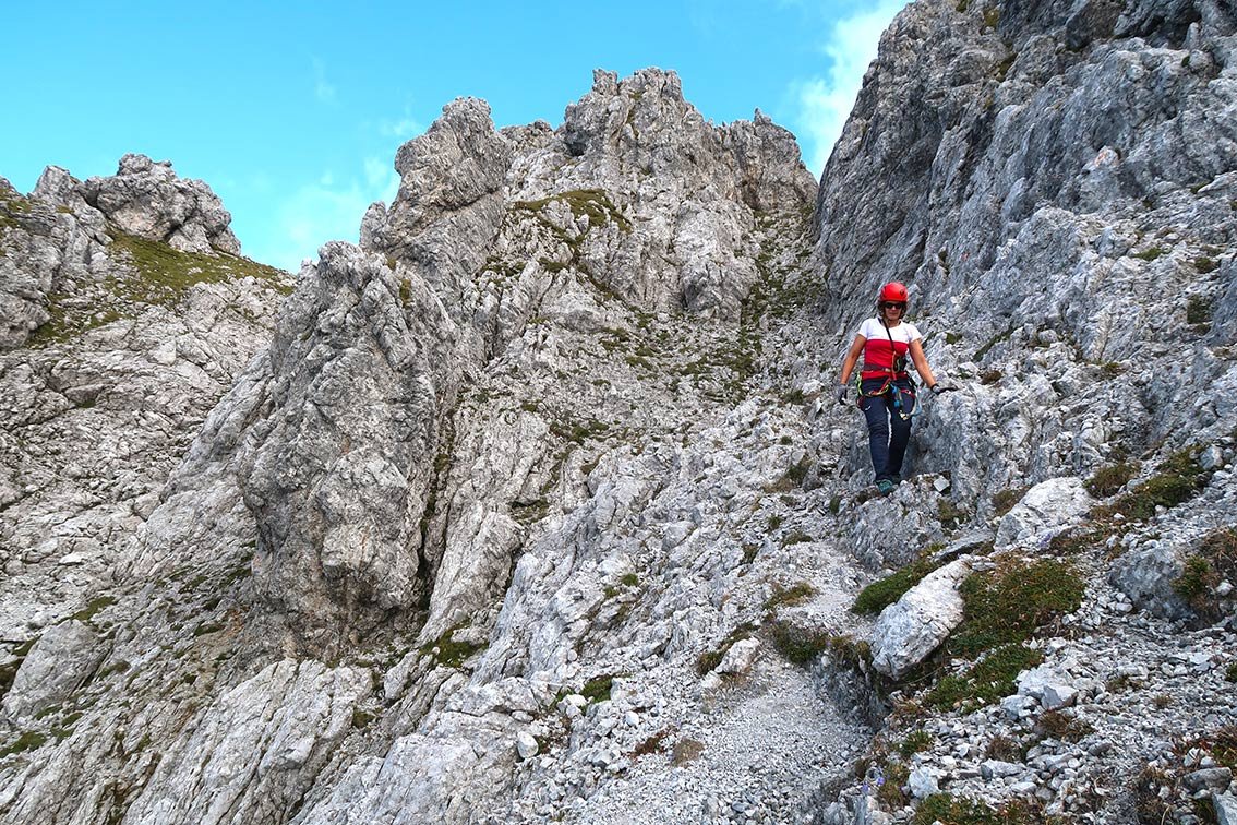 Meist klettert man zuerst den Grandlspitz-Klettersteig und geht von der Taghaubenscharte weiter zum Gipfel der Taghaube - ein direkter Abstieg führt dort hinunter zur Erichhütte.