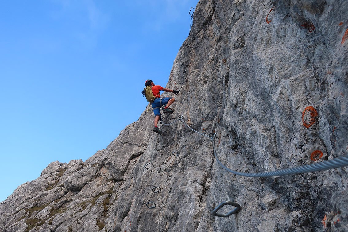 Schöner Klettersteig, den man sehr gut am Tag der Anreise in Angriff nehmen kann, um sich für den Königsjodler einzuklettern. Der kühn angelegte Steig, mit ca. 170 Klettermetern, führt durch die Südwand des Grandlspitzes und ist im oberen Teil anspruchsvoll und ausgesetzt. Interessant ist der Klettersteig in Kombination mit einer Besteiung der Taghaube - wird sehr gerne als Rundtour gemacht.