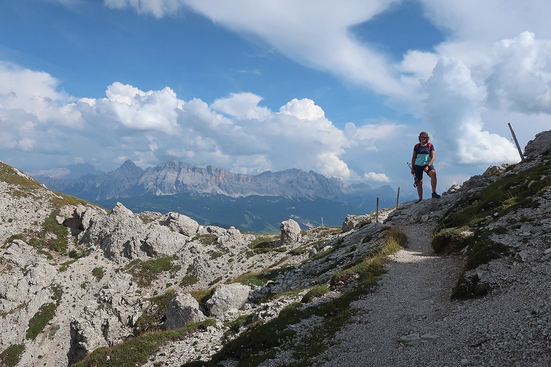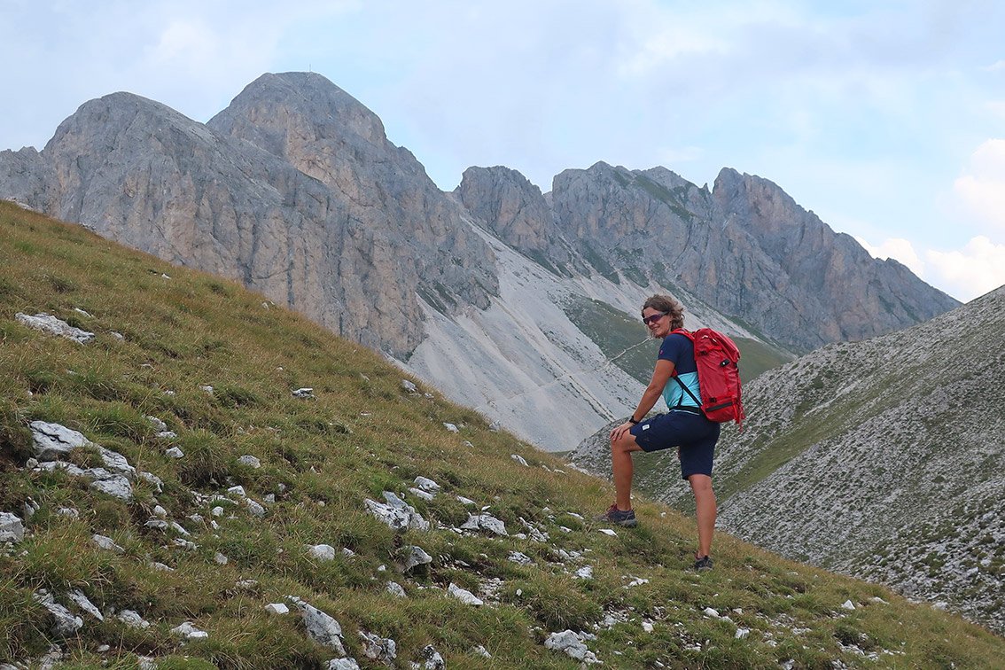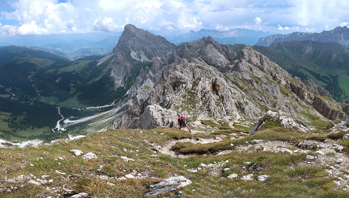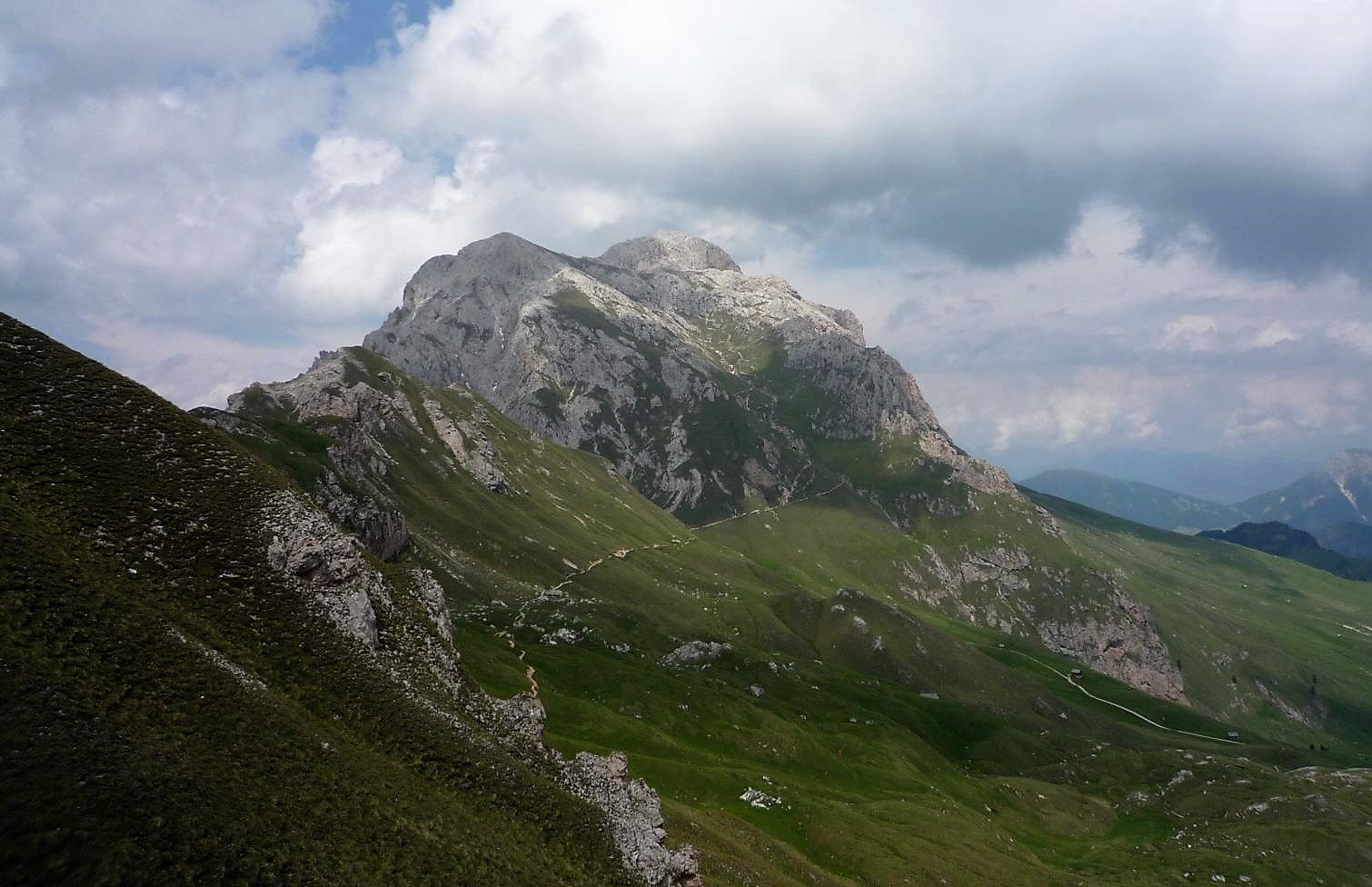 Von der Peitlerscharte steil nach Norden hinunter (Weg 4), auf einer Höhe von ca. 2050 m zweigt links der Weg zum Russiskreuz ab.