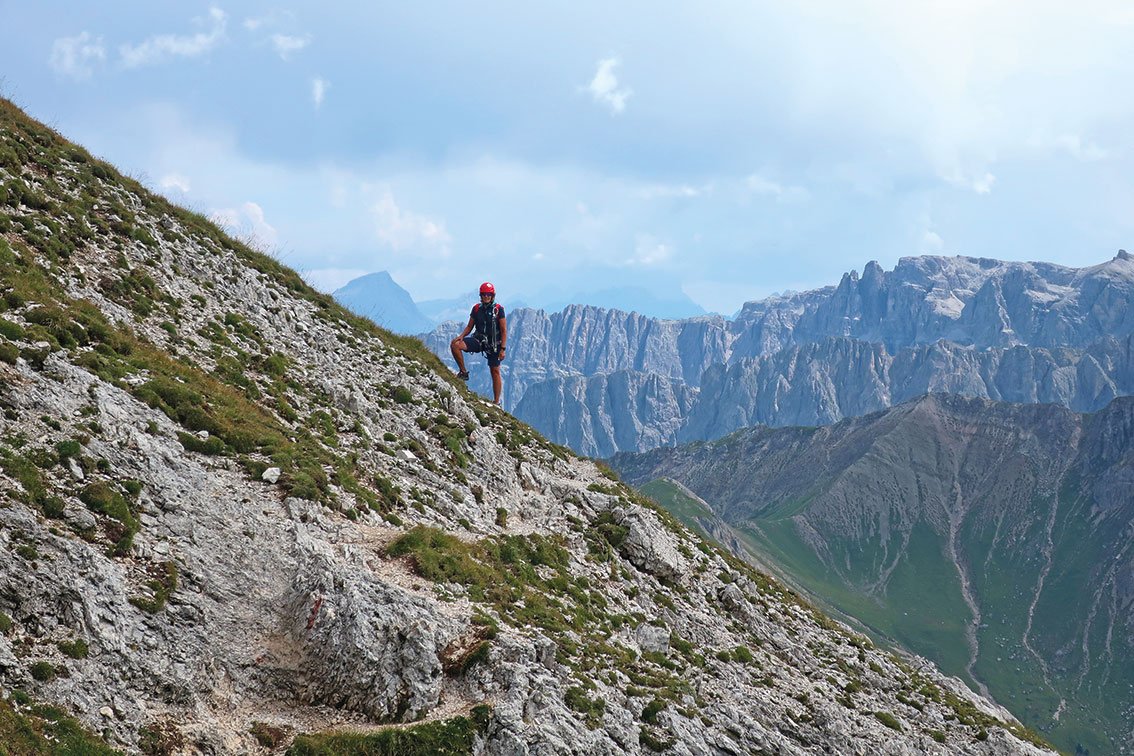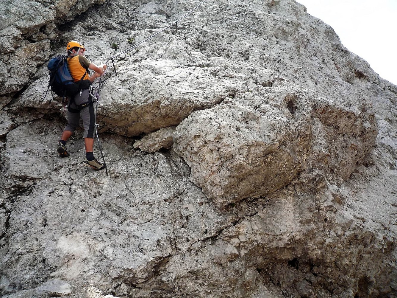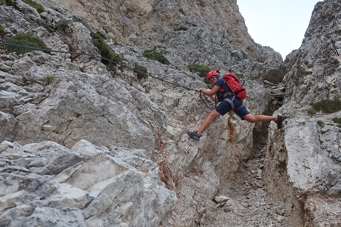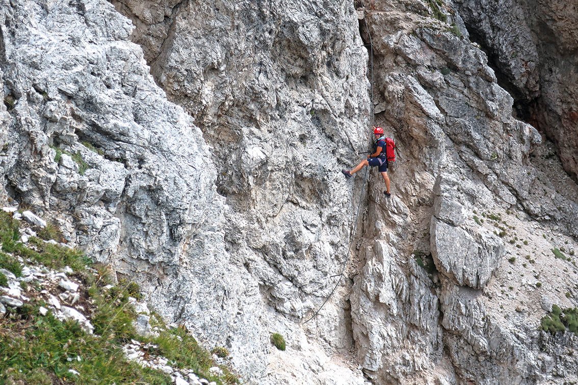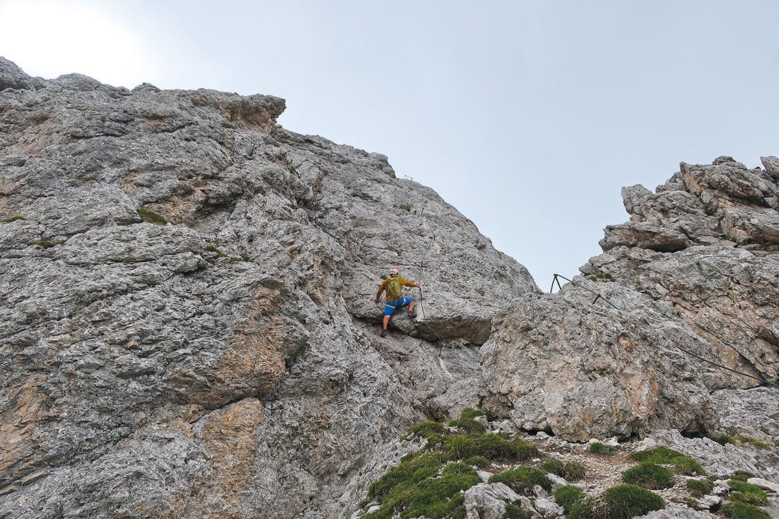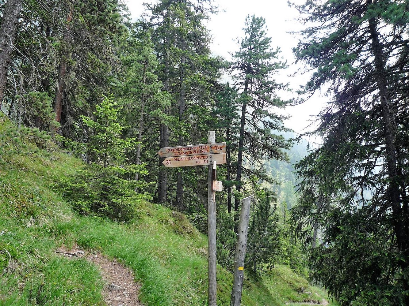 Auf dem Alta Via Günther-Messner Weg (G.M.) bis zum Kälbergarten (Joch mit Kreuz daneben), dort links in Richtung Tullen, kurz vor dem Tullen-Gipfel (optional, 75 Hm/A) bei einem Wegweiser nach rechts zum Beginn des Stahlseils.